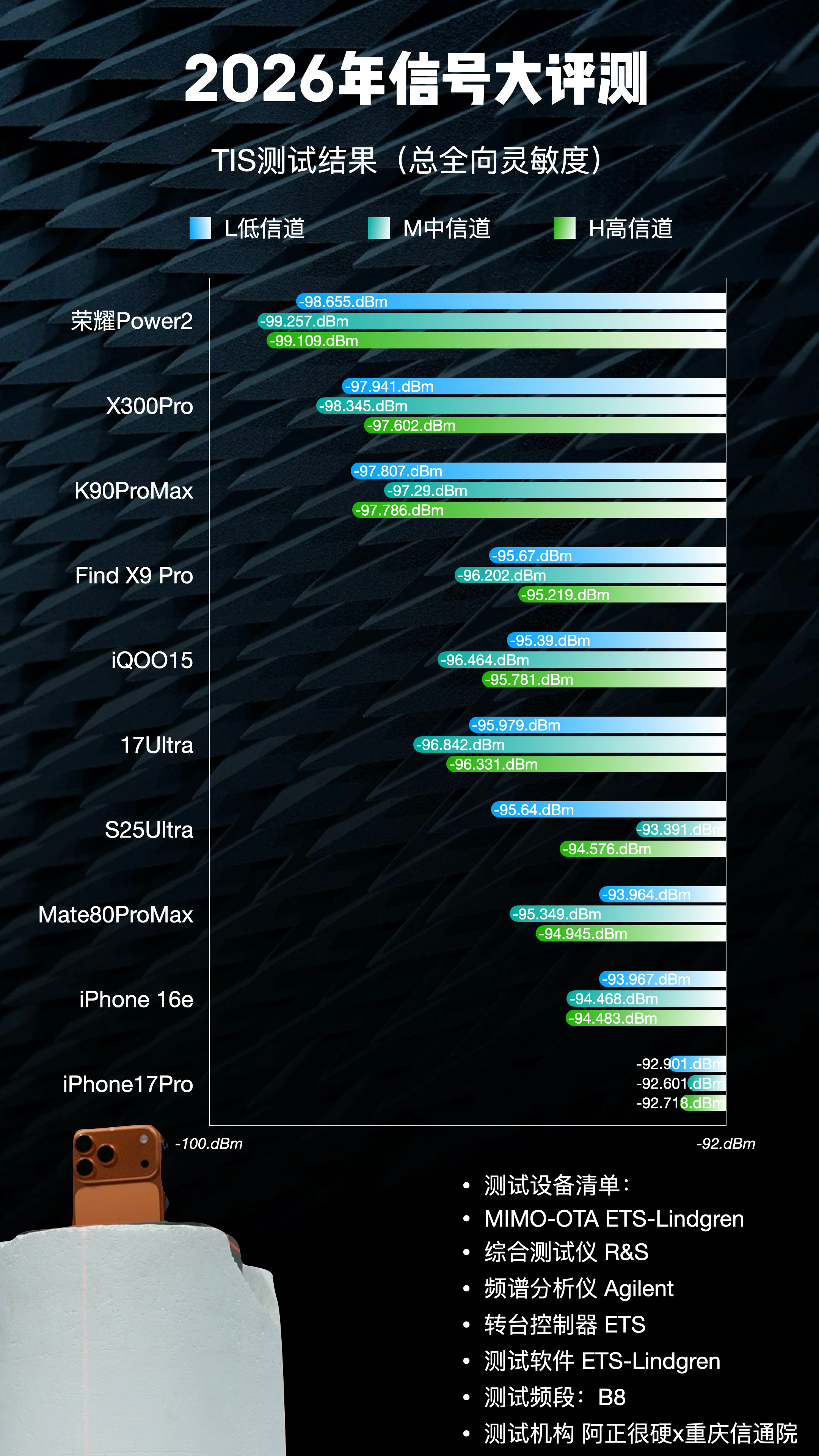 测试结果如图。如果你看懂这些也没关系直接看排名。第一梯队(增强信号水平):荣耀Power2/vivo X300Pro/Redmi K90ProMax第二梯队(主流信号水平):OPPO Find X9 Pro/iQOO 15/小米17Ultra/三星S25Ultra/华为Mate80ProMax第三梯队(标准信号水平):iPhone16e/iPhone17Pro测试结果来自:阿正很硬x重庆信通院鸣谢重庆信通院对我们技术上的大力支持!