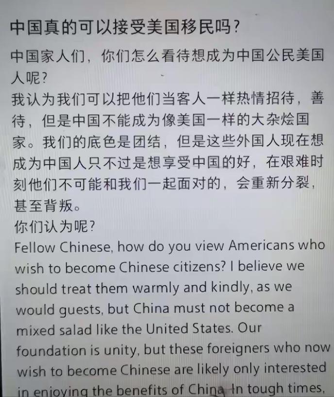 中国一穷二白,一无所有的时候怎么不想来当中国人? 现在中国强大了,各个方面都优于西方国家了, 就有很多西方人说想做中国人了! 你想放弃美国籍成为中国人,我们还不答应呢[呲牙] 还是想想怎么建设好自己的国家吧。 现在西方掀起了一场“我是中国人”的网络热点, 从喝热水、进门换拖鞋这种看起来很平常的小事做起, 要说这个好习惯你们想学习那是一点问题没有, 只要你愿意学,咱也愿意教。 但还有一股风,那就是看着中国好了,都想来当中国人了。 当年咱们啃窝头、战风沙的时候,没见谁凑过来沾光。 现在高铁坐得舒服、日子过得红火,倒想起往这儿挤了?哪有这么好的事儿! 中国的好是咱祖辈父辈硬扛出来的,是咱自己人一分一厘攒出来的。 有那心思琢磨换国籍,不如回去好好整整自己的国家,别到最后啥也不是,还得羡慕别人的日子!