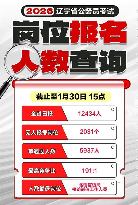 🚨 辽宁省考报名数据新鲜出炉! 截止 1 月 30 日 15 点,2026 辽宁省公务员考试的报名情况时时汇报,这些关键数据请收好👇 ✅ 全省已报:12434 人 ✅ 无人报考岗位:2031 个 ✅ 审核通过人数:5937 人 ✅ 最高竞争比:191:1 🔥 人数最多岗位:北镇信访局接访岗位工作人员 想捡漏的同学可以重点关注那 2031 个无人报考的岗位,竞争压力会小很多! 而竞争最激烈的岗位已经达到 191:1,想冲刺热门岗的同学要抓紧最后机会了!