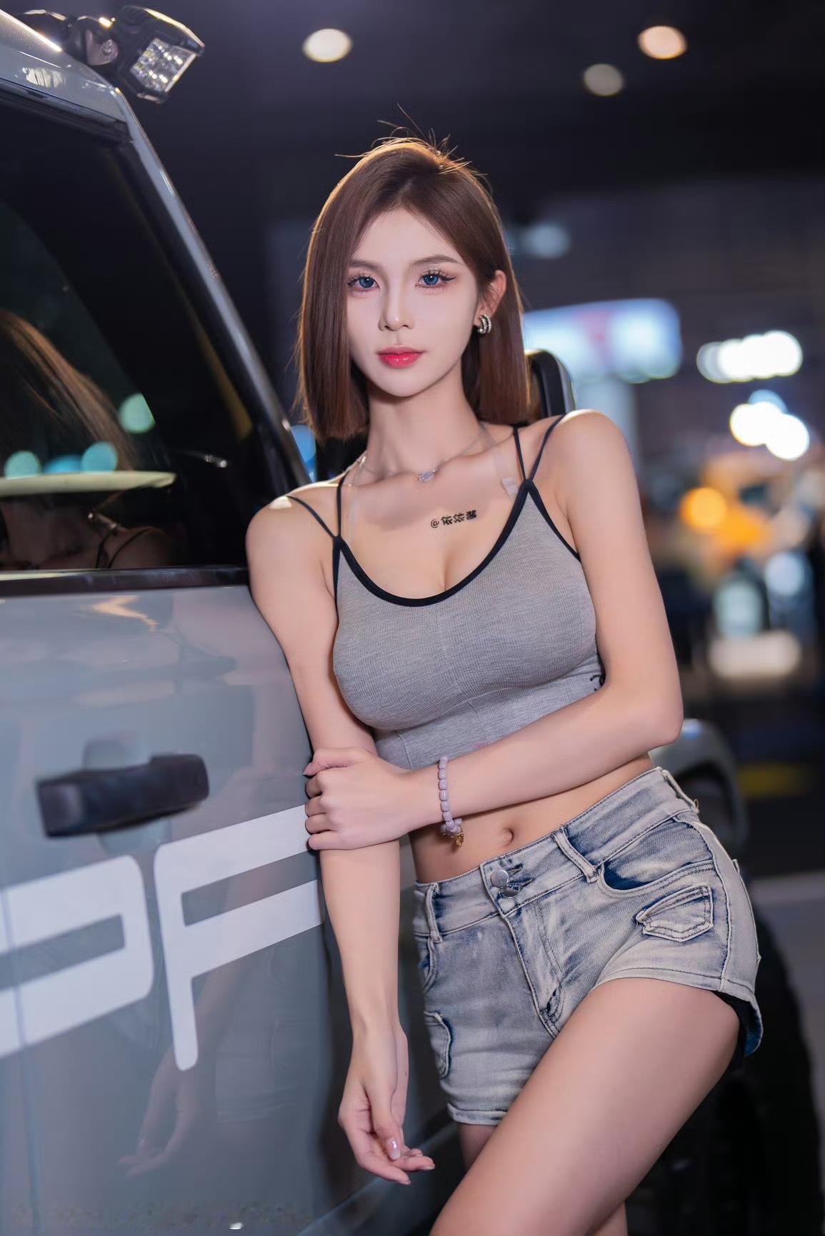 程儿领衔,酷炫车模,机车风穿搭,夜晚停车场,炫酷自拍!