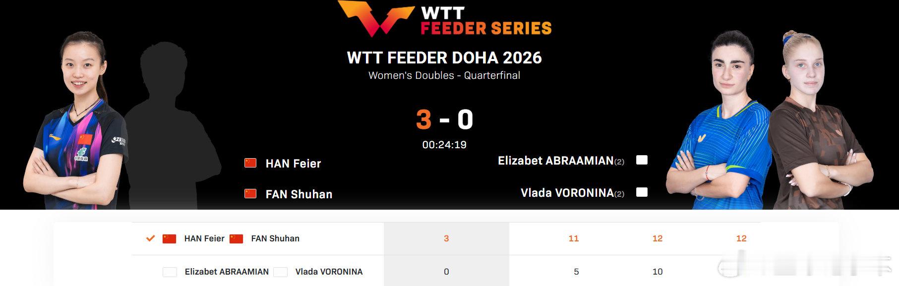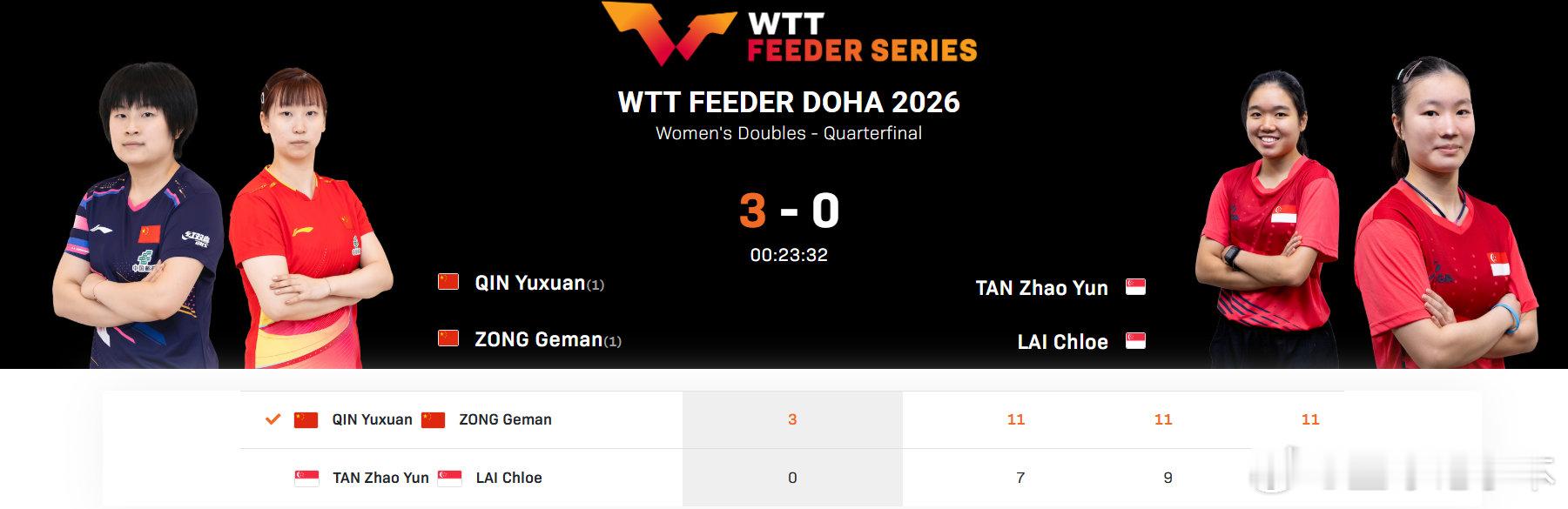 2026WTT支线赛多哈站女双,杨屹韵/朱思冰、韩菲儿/范姝涵、覃予萱/纵歌曼分别以3-0的比分战胜对手,晋级四强。