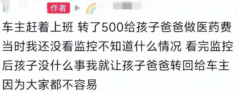 这位妈妈真是好样的!一个爸爸带着小孩在路上,自己埋头打电话,小孩就在路边跑来跑去。结果一辆电动车过来,把孩子给碰倒了。 爸爸赶紧冲过去扶孩子,转头就吼骑电动车的:“骑那么快干嘛!” 骑车的人也很慌,当场转了500块钱当医药费。本来以为这事就这么不了了之了,结果孩子妈妈回头看了监控,发现是自家孩子乱跑、爸爸也没看住,马上让老公把钱退回去了。 她还把视频发上网,说当爸妈的得反思,得看好孩子,不能全怪别人。 评论区里我发现好多人都说这妈妈“人间清醒”。 有人讲:“这要换个别家,可能500块都不够,还得吵一架。” 也有人吐槽爸爸:“自己光顾打电话,孩子乱跑都不管,出了事还先吼别人。” 还有不少家长说实话:“带孩子出门真的不敢分心,一秒钟没盯住就可能出事儿。” 也有人夸这妈妈:“能主动退钱还反思,这样的家长现在真不多见。” 但是话说回来,咱们平时带娃出门,是不是也经常这样?一边看手机、回消息,一边让孩子在边上玩,总觉得“我看得见”“没事”。 可真出了事,第一反应往往是怪别人:你怎么不慢点?你怎么不看着点? 其实路上骑车的也冤,有时候孩子突然窜出来,根本刹不住。这件事难得就难得在,妈妈没护短,没跟着一起怨别人,反而回头想:我自己有没有管好? 这不是说骑车的人完全没责任,但能先反思自己,就已经胜过很多吵架扯皮了。监护人不光是陪着就行,眼睛和心思都得在孩子身上。 要是你家孩子在路边玩,你会一边打电话一边看孩子吗?