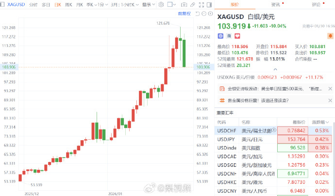 【#白银跌麻了#】1月30日,现货白银日内跌幅扩大至10%,报103.85美元/盎司,较昨日高点回落约18美元/盎司。(财联社)#黄金白银价格双双暴跌原因#
