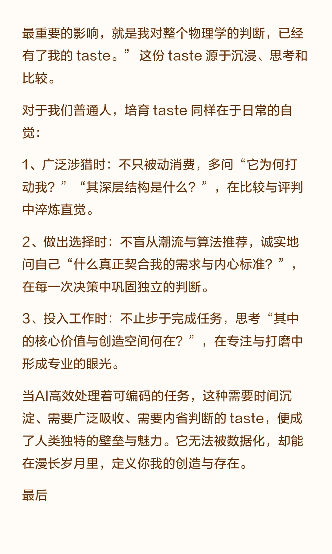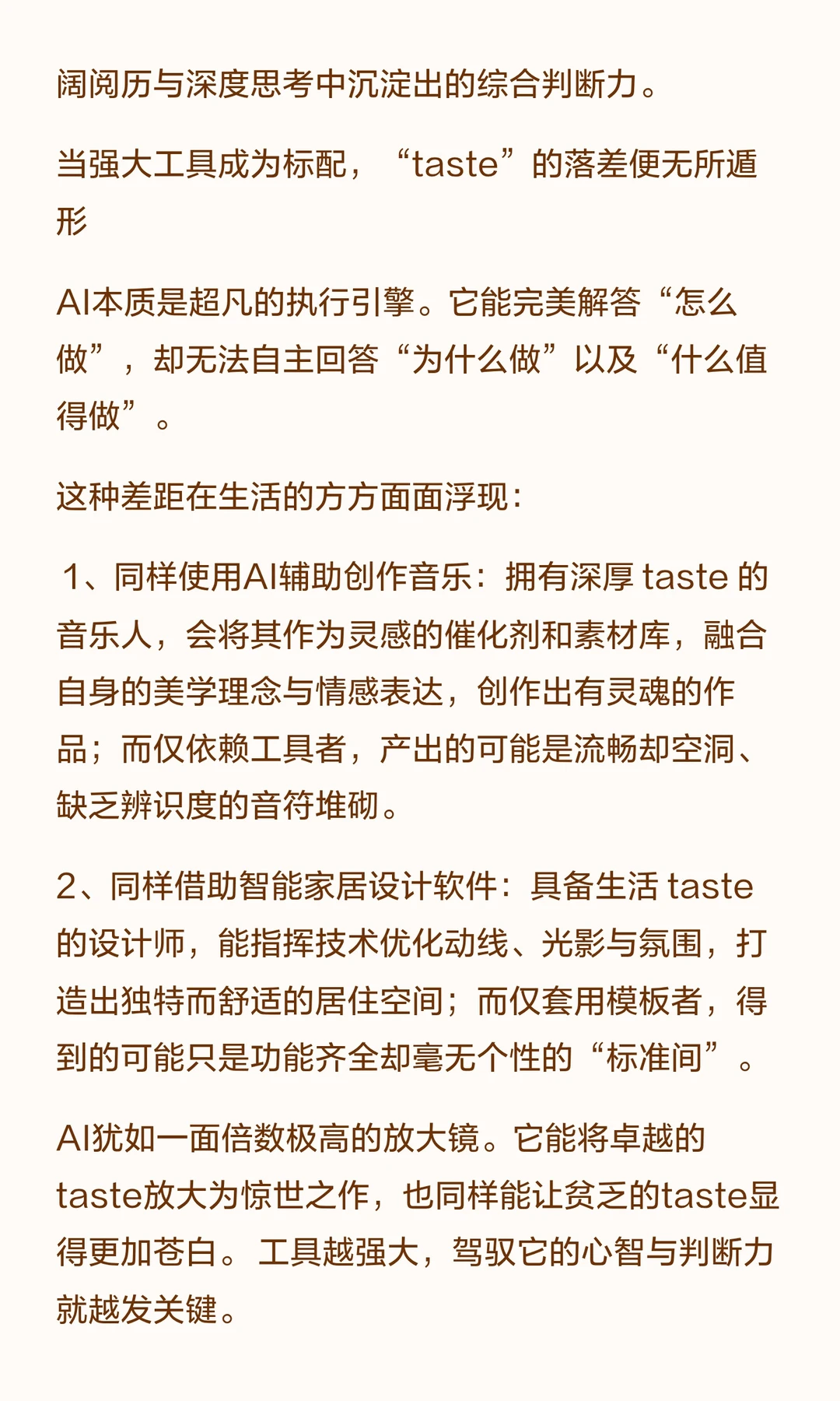 AI能提升执行效率,但“taste”——对重要性和美妙的直觉判断,仍是成就的关键。