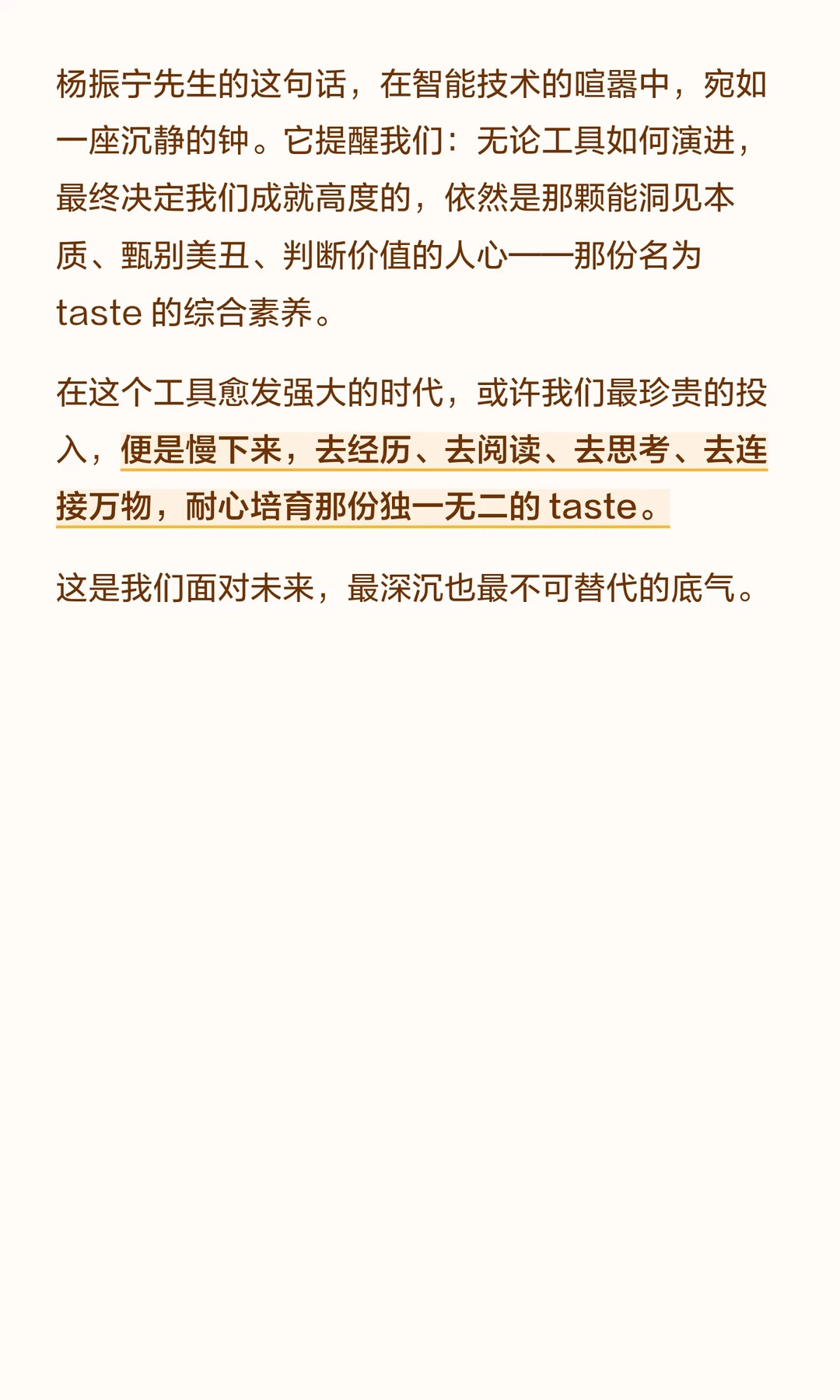 杨振宁先生多年前的观点——“一个人的成就大小,跟 taste 有关”,才深感其穿透时间的洞察力。工具的能力可以无限扩展,但那种难以言传的“taste”——对何为重要、何为美妙的直觉与判断——正成为人与人成就的核心分野。