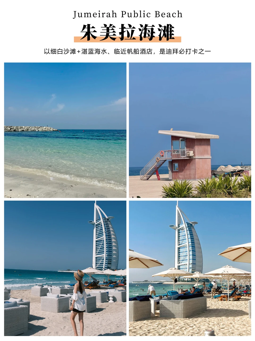 🔥朱美拉海滩:以细白沙滩+湛蓝海水、临近帆船酒店,是迪拜必打卡之一
