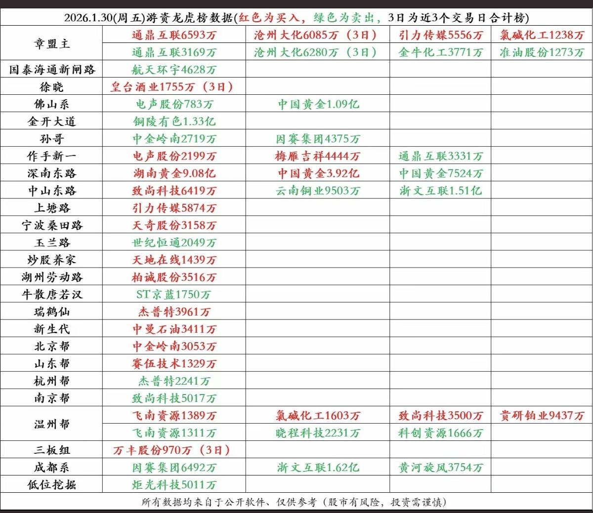 1.30周五 游资大佬 抢筹 龙虎榜! 章盟主 入 通鼎互联 引力传媒 作手新一 入 梅雁吉祥 通鼎互联 新生代 入 中曼石油 中山东路 入 致尚科技 通鼎互联、中国黄金、引力传媒获多家游资共同抢筹。