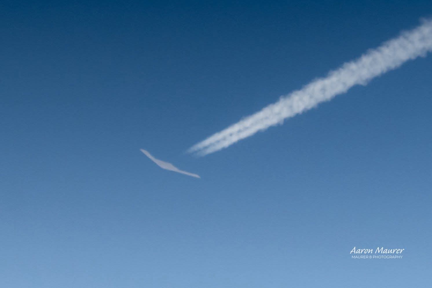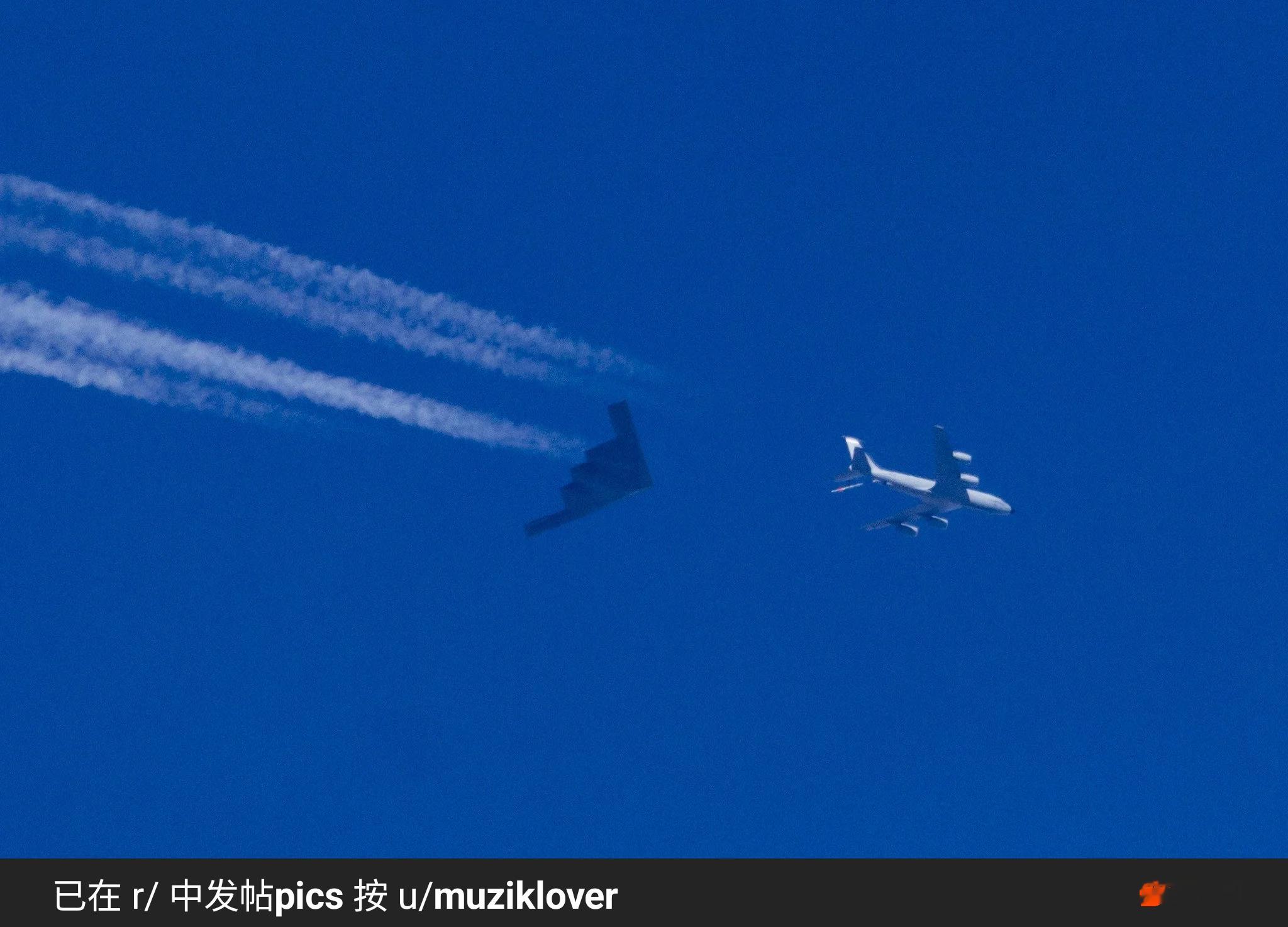 B-21拖着两条凝结尾,不过四具发动机的B-2拖凝结尾时,通常只看到左右两条。