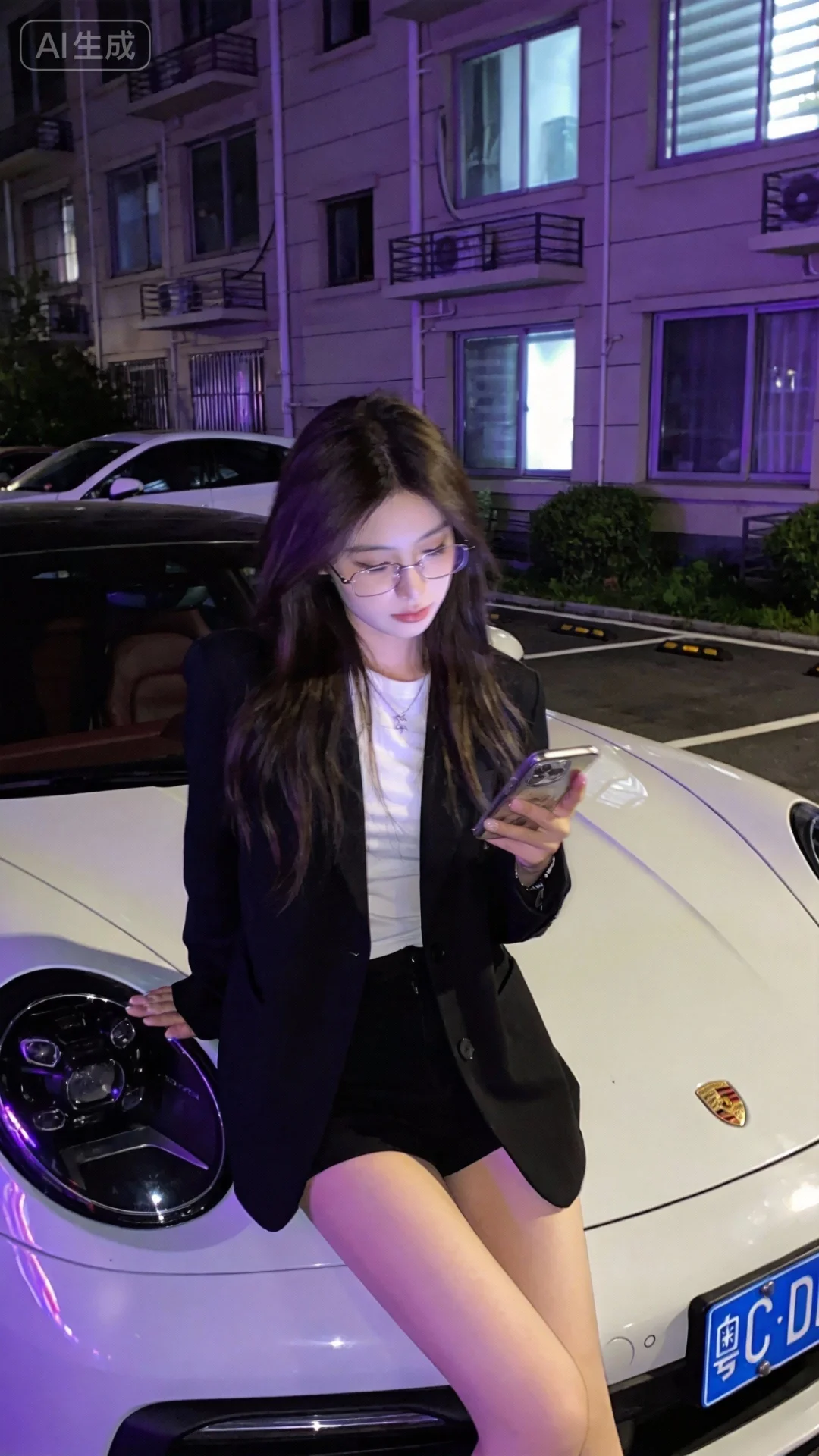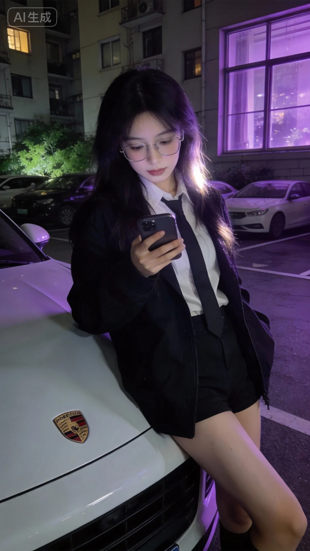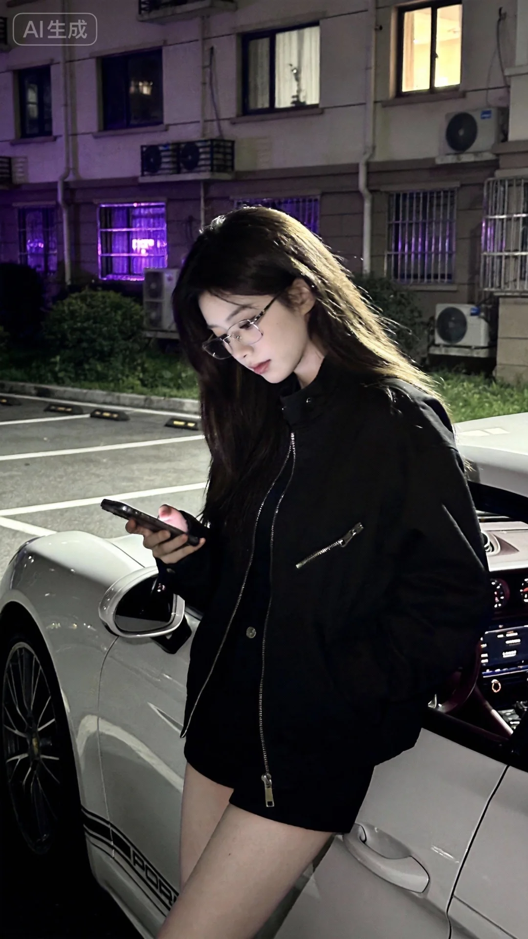 这是一个超高颜值美少女,白皙女神,冷白皮,韩系酷帅,潮流时尚穿搭,无框眼睛,可爱表情爱豆穿搭,身材高挑,随拍风格, 前卫时尚,情绪氛围, INS风,高级感, 杰作,上半身特写,随拍风格,主要是一个穿着潮流时尚服装的乖张女孩,爱豆造型,低头靠站在保时捷旁,窗外小区单元楼前停车位,后面可看到小区绿化),一只手拿着手机,紫色氛围灯,微微曝光,发丝光,侧光,商业修图,日常抓拍,梦幻朦胧感,暗朦,深夜