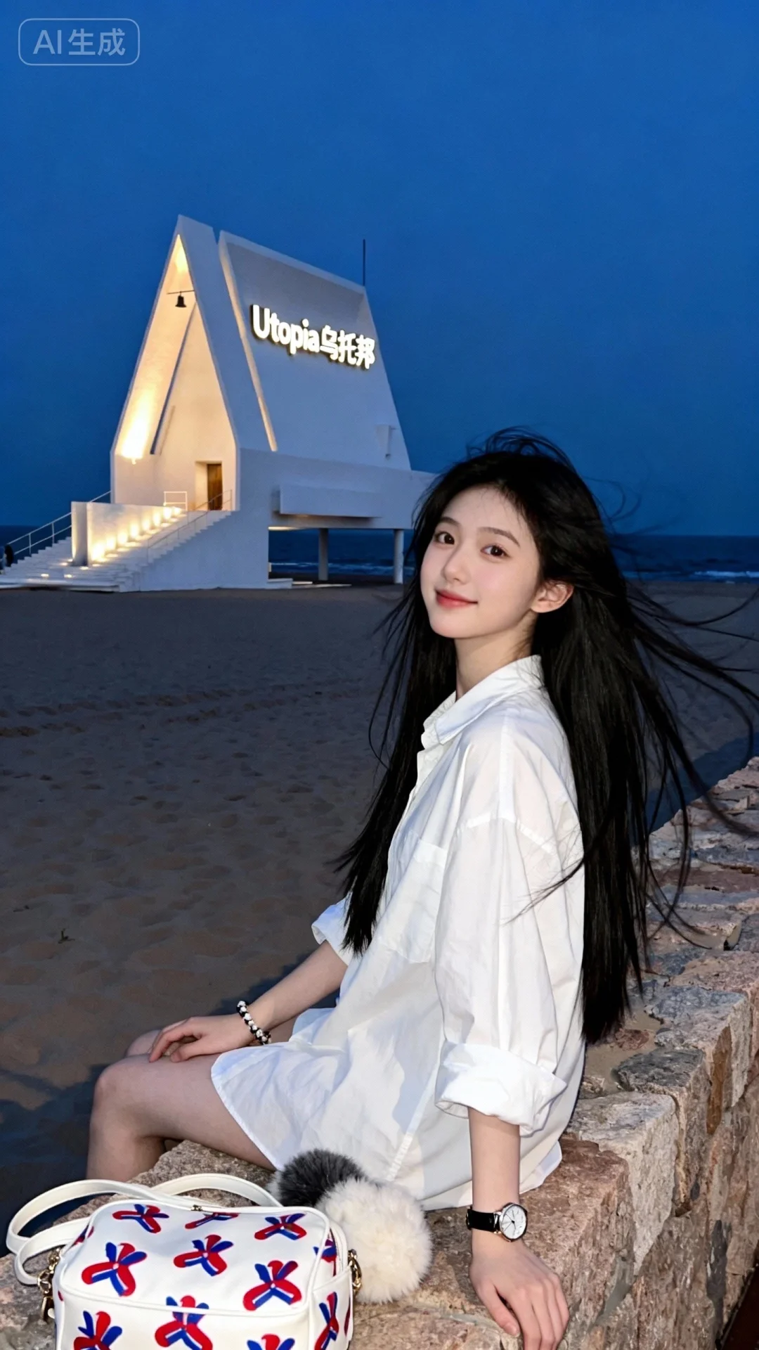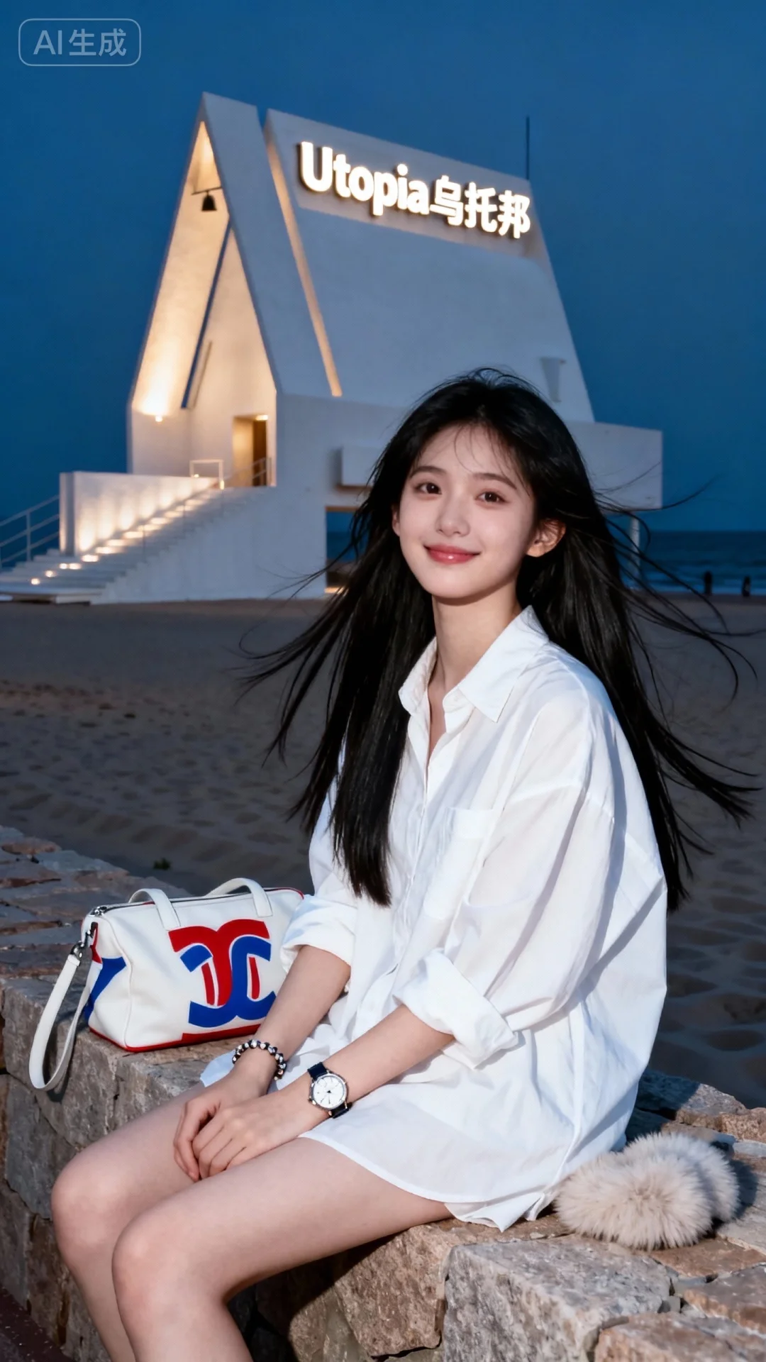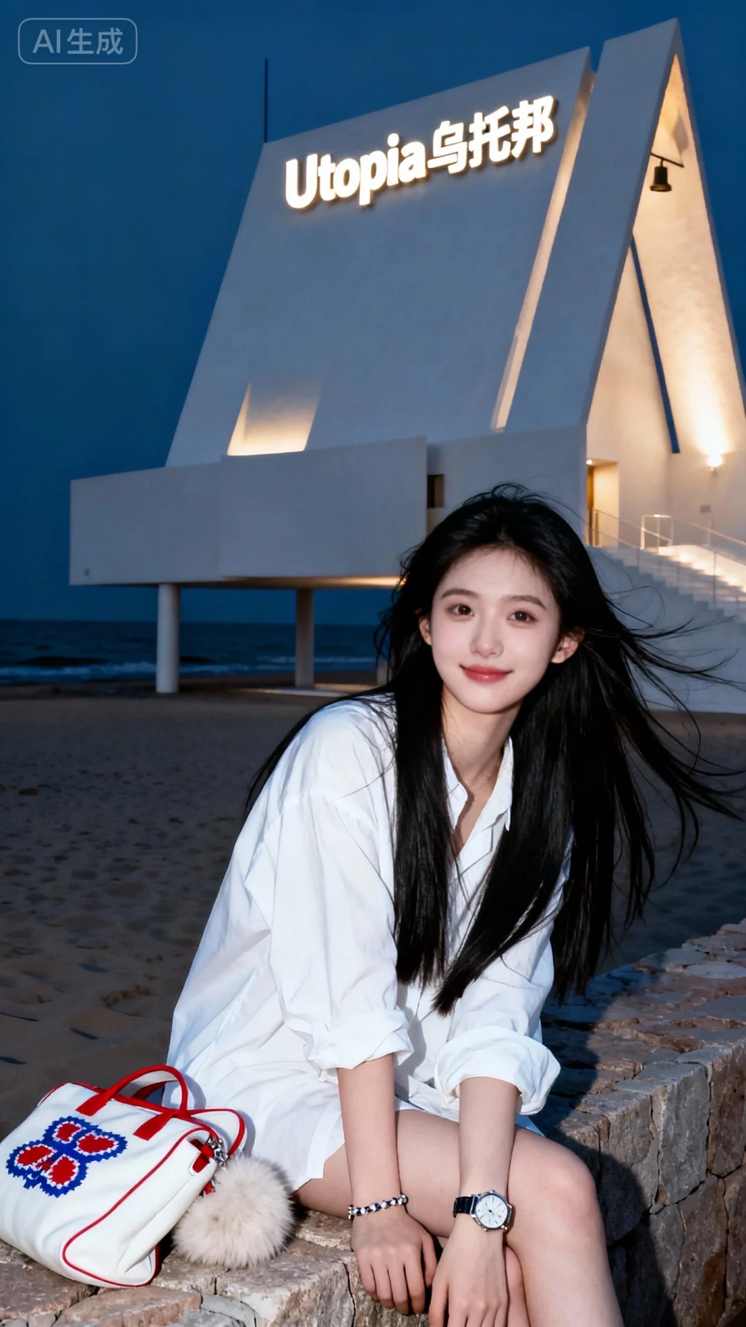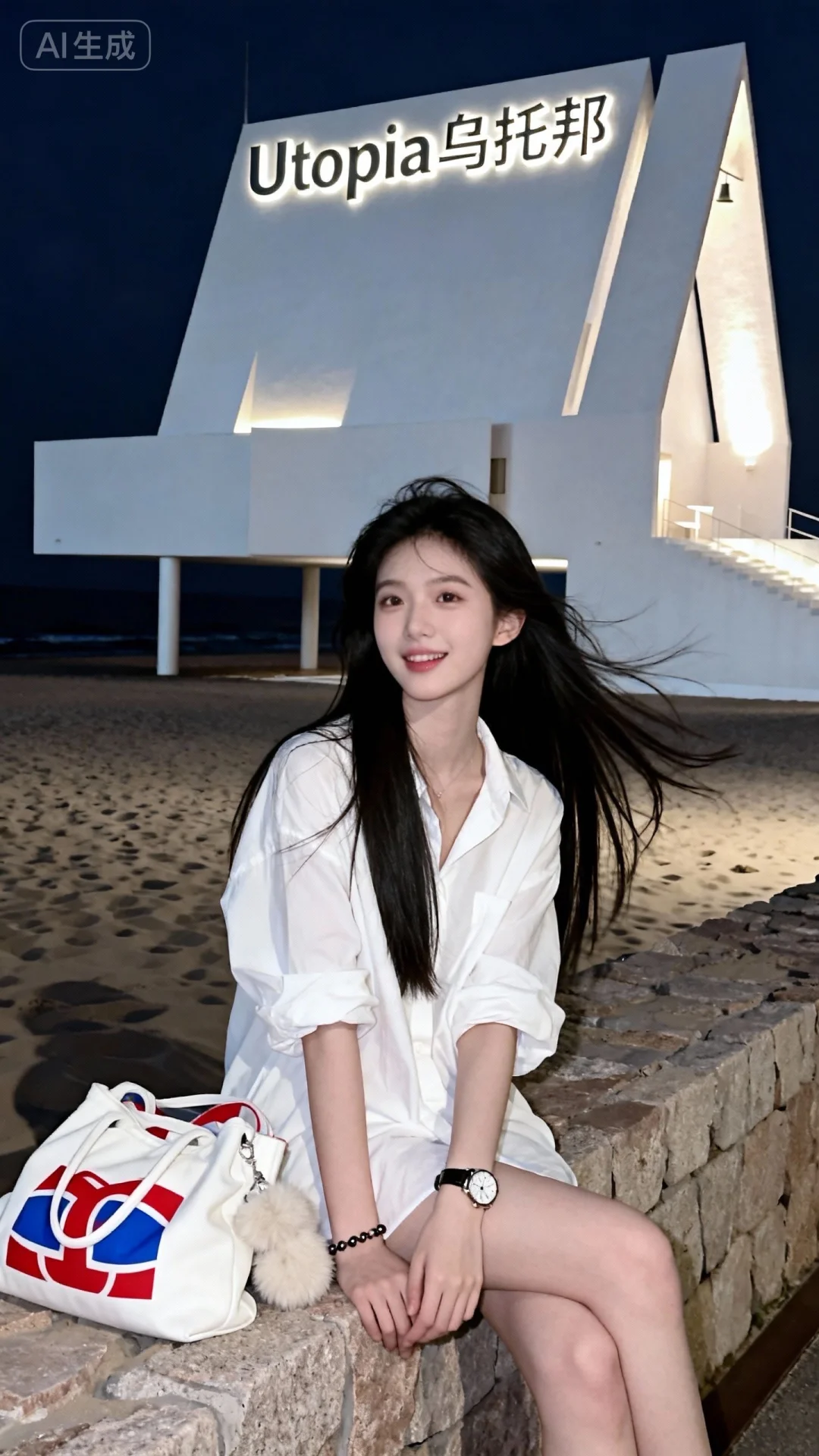 真实摄影,佩戴手表、手链,身穿白色宽松衬衫,侧坐在石质堤坝上,身旁有带红蓝图案的白色包袋与毛绒物品,背景是夜晚的沙滩与亮着“Utopia 乌托邦”立体招牌的白色现代建筑,整体风格随性、浪漫,充满海边夜景与艺术建筑的氛围感,(电影级面光:1.6),(光线追踪:1.5),(冷白皮漫感质感的光滑皮肤:1.7),(人物有最好的骨相:1.2),(网感脸:1.6),(网感妆:1.6)身材完美,莫兰迪配色,高颜值网红,INS风,幼态脸,19岁女生尖下巴,三庭五眼比例均衡,身材娇小,细腻陶瓷水嫩肌肤,偏冷白皮,随机的妆容,随机的饰品,随机的动作,侧光,发丝轻飘,凌乱,随机角度拍摄,总体有很多的不确定性,但又好看,