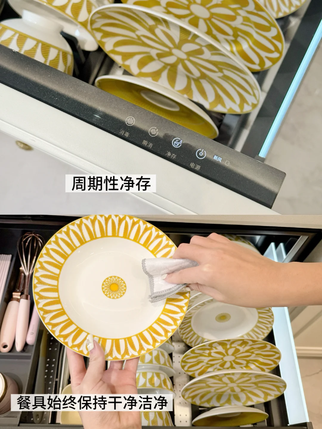 还可以app⾃定义净存时间,净存模式下碗碟功能餐具⼀直保持38℃ 左右的温热感,冬天也能⽤上暖⼿的餐具。