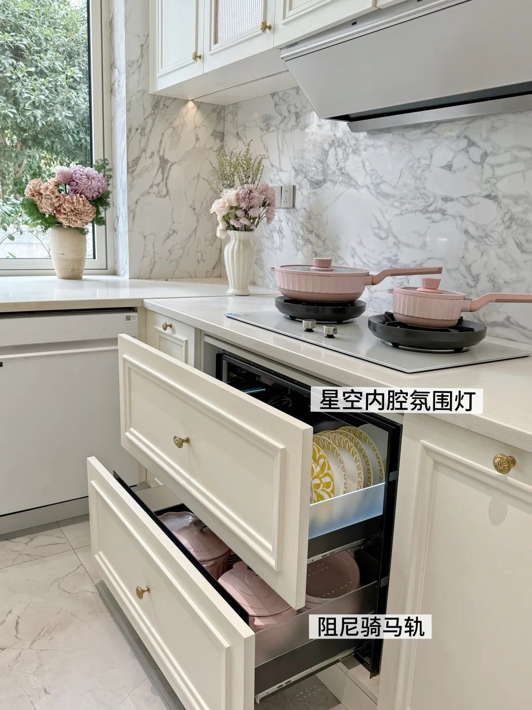 打开碗柜还有星空氛围灯设计,拿取餐具都成了⼀种享受