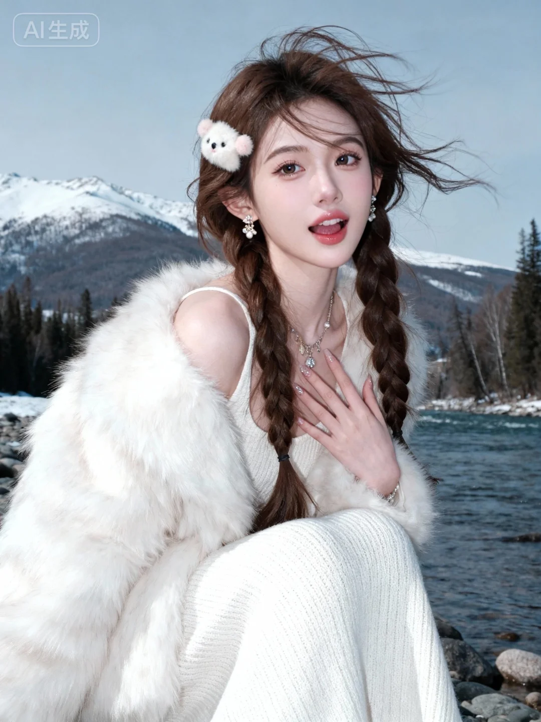在喀纳斯河边,背景雪山,超清晰画质,妆造精致,饰品精巧,棕色长发上编织可爱毛绒发卡搭配,身着白色毛茸茸皮草,内搭白色针织长裙极简风格,细节完美,五官精致,突出头发凌乱美,面部清晰,清冷调。日常快照风格,非精心构图,非专业打光。(电影级面光:1.6),(光线追踪:1.5),(冷白皮漫感质感的光滑皮肤:1.7),(人物有最好的骨相:1.2),(网感脸:1.6),(网感妆:1.6)身材完美,莫兰迪配色,高颜值网红,INS风,幼态脸,19岁女生尖下巴,三庭五眼比例均衡,细腻陶瓷水嫩肌肤,偏冷白皮,随机的妆容,随机的饰品,随机的动作,侧光,发丝轻飘,凌乱,随机角度拍摄,总体有很多的不确定性,但又好看,