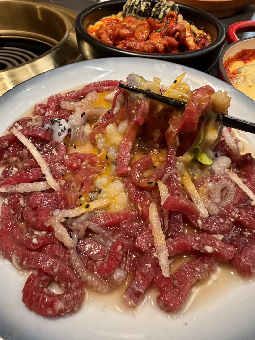 上海,终于吃上了整只辣鱿鱼海鲜面!! 酱蟹和烤肉也不错,韩国小哥哥亲自帮烤!中文说的很溜!