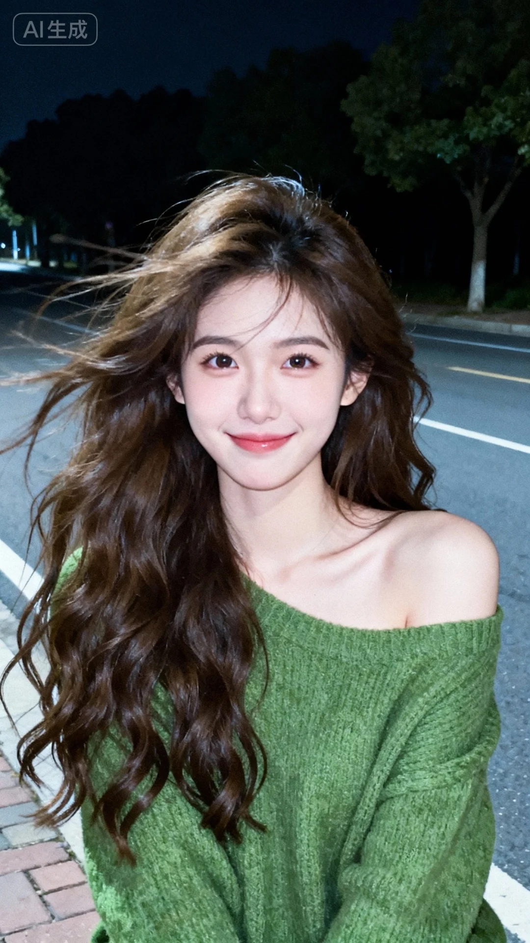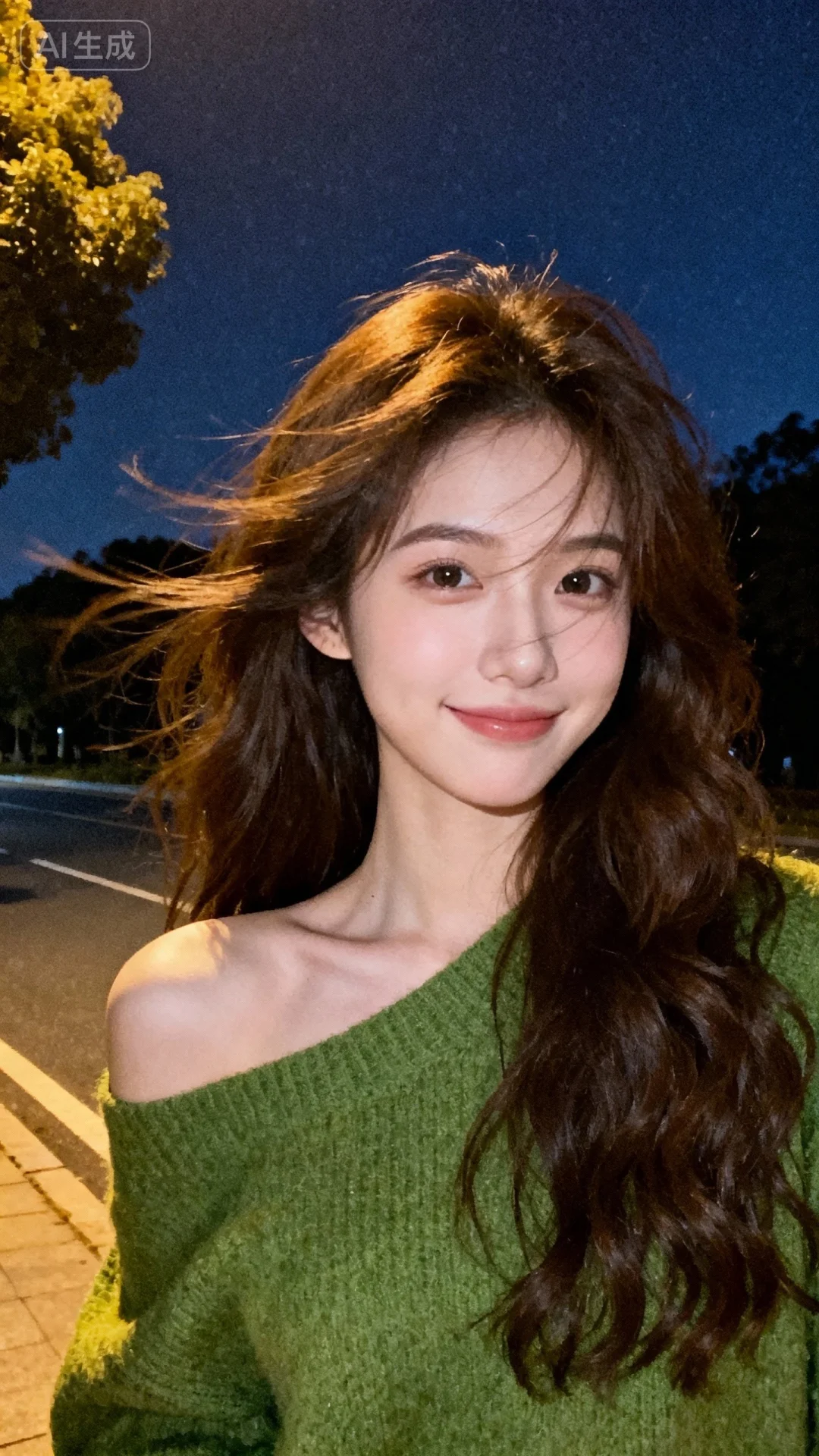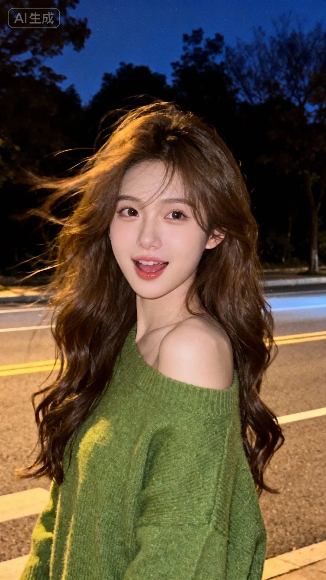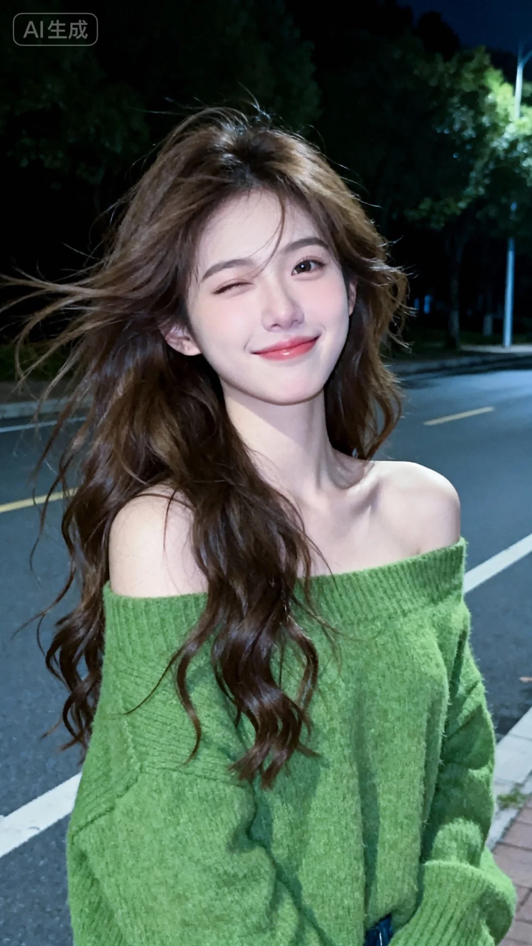 漂亮女生,19岁网红女,冷白皮。棕色长卷发(被风吹动,略显凌乱),绿色露肩毛衣,夜晚户外街道场景(背景、马路、树木、昏暗的环境)给皮肤镀上一层清透的质感,带着“夜间随拍”的网感,既日常又有氛围感,手机拍摄风格,古早滤镜,做可爱表情