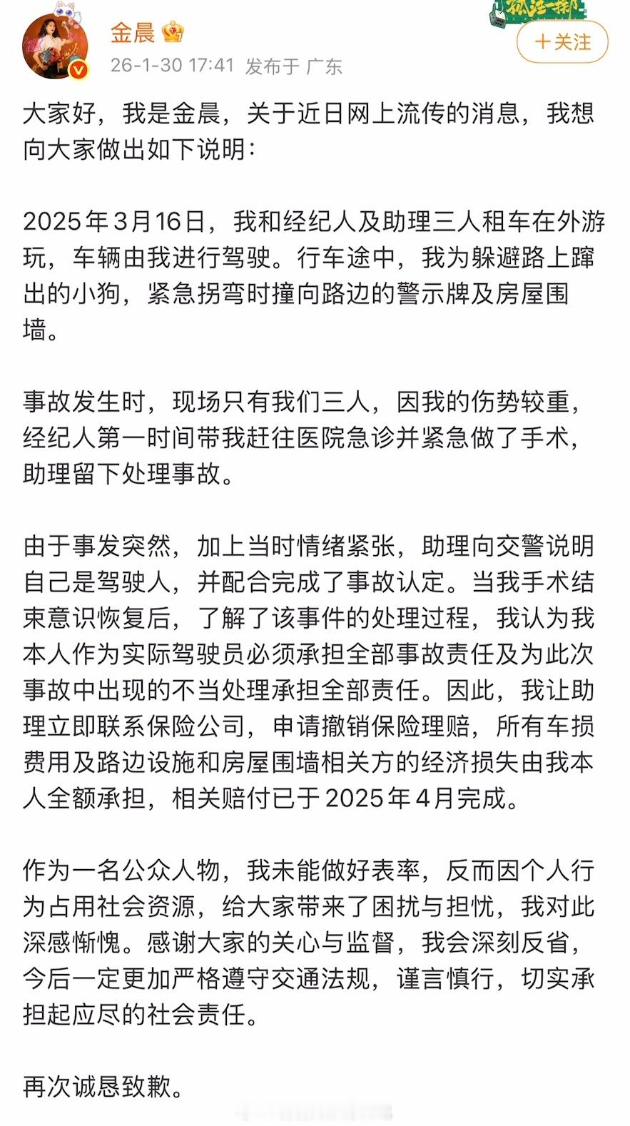金晨发微博回应了!金晨说是自己开车出了事故,然后先去医院处理。助理留下来,向交警说自己是驾驶人。金晨觉得这样不妥,主动承担责任,撤销保险理赔。简单来说,金晨好,助理坏。