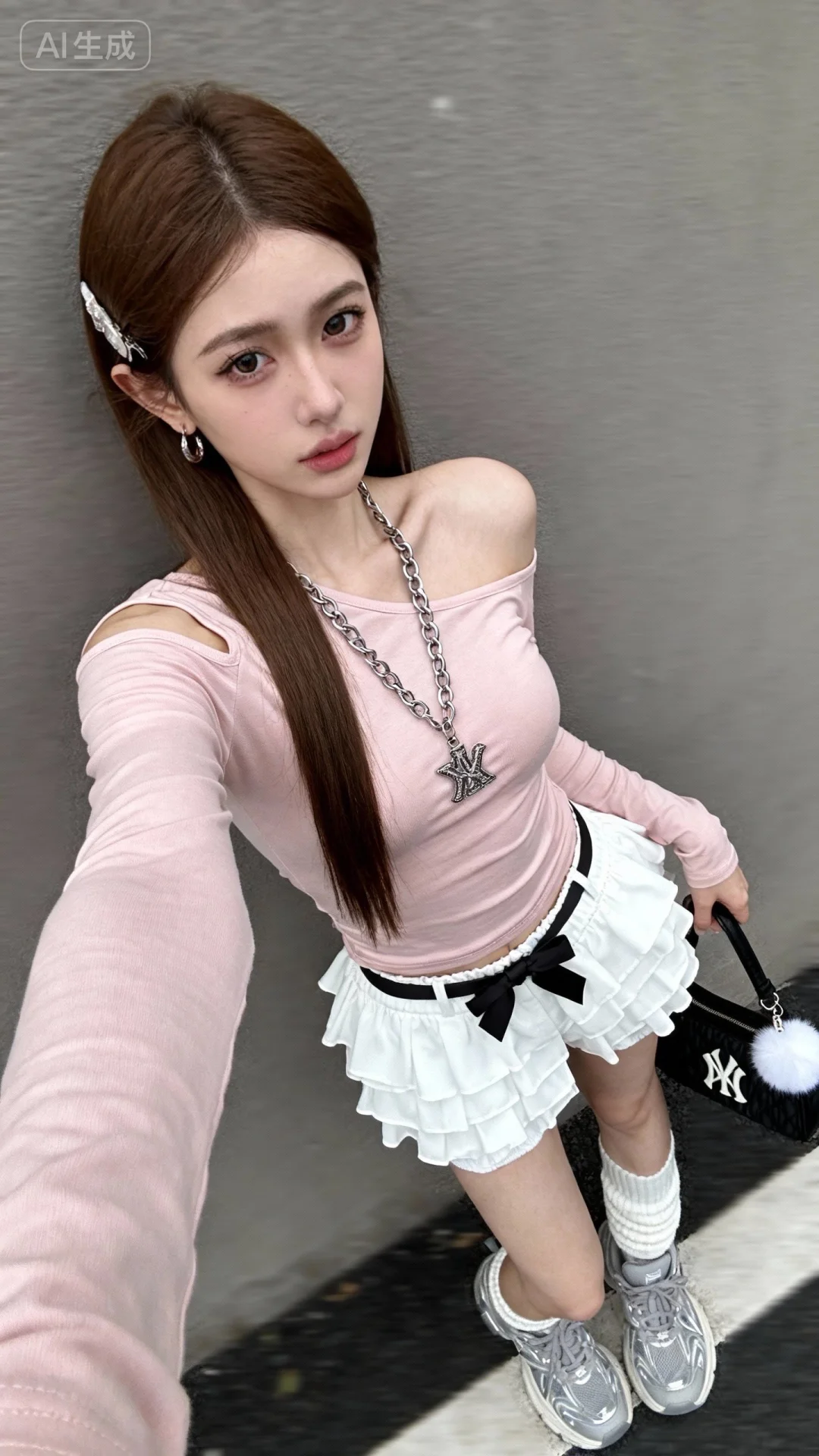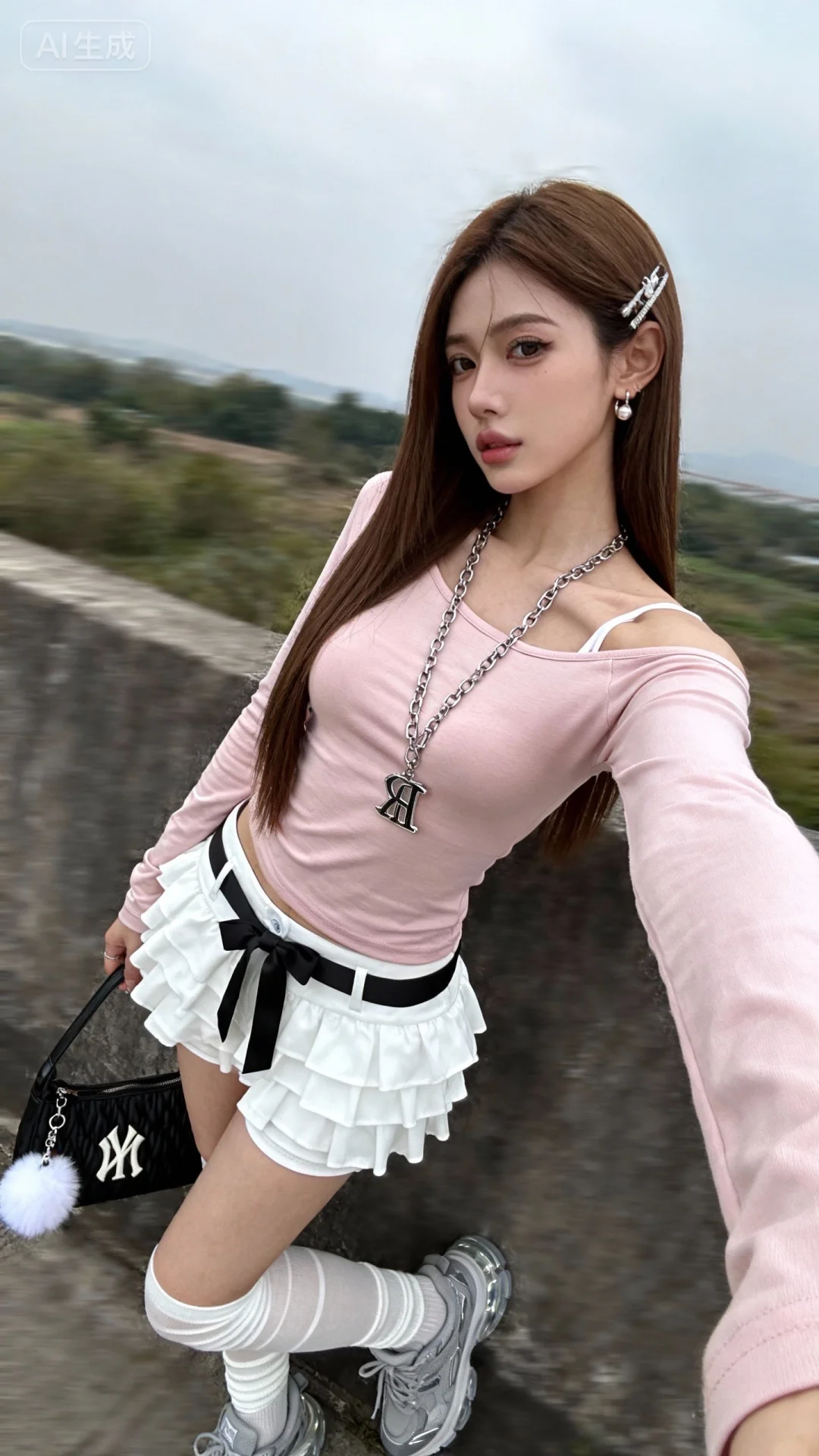 - 包包:黑色手提包,搭配白色毛绒挂饰。