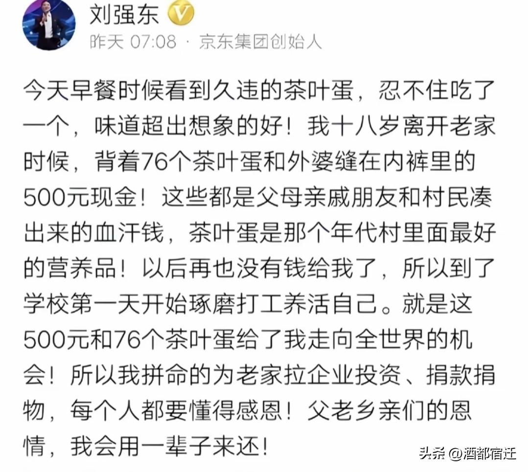 1992年,江苏宿迁光明村的刘强东考入中国人民大学,无奈家境贫寒,凑不齐上学费用。关键时刻,乡亲们纷纷伸出援手,76户人家每户送来一个鸡蛋,还共同凑了500元。这份淳朴的善意,照亮了他的求学之路。 多年后,刘强东创办京东,功成名就,始终没忘乡亲们的恩情,全力回馈家乡。2009年,他力排众议,将京东全国客服中心落户宿迁。此后,又陆续投建京东智慧城、数字金融产业园、科技研发中心、京东云华东数据中心、京东中央厨房、京东智能制造产业园、淮海经济区仓储物流中心、京东物流平行总部、京东农批产业园、京东机器人产业园等项目,总投资超200亿元。 刘强东连续十多年为光明村乡亲们发放年货和红包!2025年,京东折扣超市在宿迁市开了五家! 这一决策带动当当、途牛等20多家企业入驻宿迁,让这座传统农业小城摇身一变,成为“客服之都”“电商新城”。 2009 - 2025年,宿迁GDP从810亿元增长至超5000亿元。京东直接带动超2万人就业,吸引3.7万人才返乡,光明村超200户村民实现本地就业,人均年收入达4.8万元。 这份跨越数十年的双向奔赴,不仅是善意的传递,更是感恩与责任的践行,成了一段温暖的传奇。