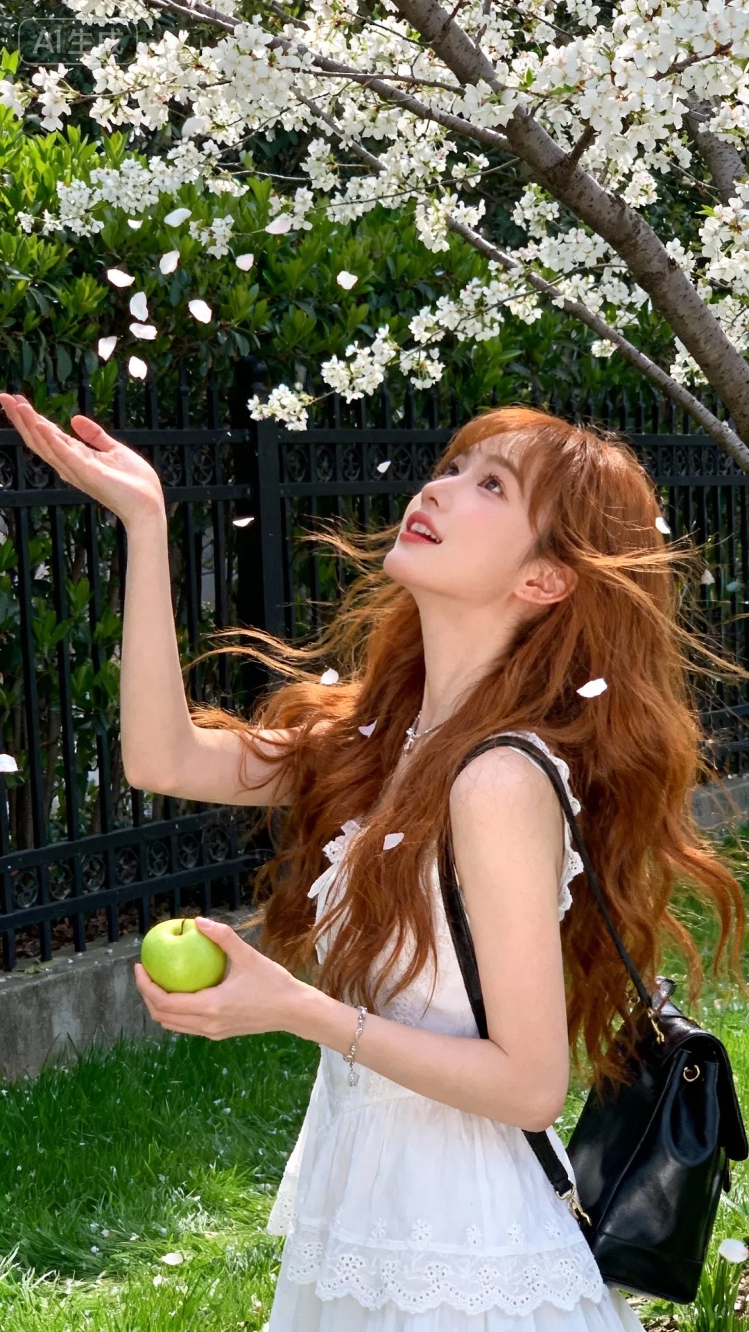 真实摄影,亚洲美少女薇薇,小清新风格,冷白皮,水光肌,超白皮肤泛着光泽,红棕色长发,身着白色蕾丝花边连衣裙,肩挎黑色包包,手持青苹果,在开满白色小花的树下,抬手让花瓣飘落;周围是绿色草地与树木,背景有黑色铁栅栏,整体风格清新治愈,充满春日花园的浪漫氛围美感,倾斜构图,(薇薇容颜绝美,正面照,超清晰画质,妆造精致,饰品精巧,可爱妆造,温柔大方,五官精致,面部清晰,(电影级面光:1.6),(光线追踪:1.5),(冷白皮漫感质感的光滑皮肤:1.7),(人物有最好的骨相:1.2),(网感脸:1.6),身材完美,莫兰迪配色,高颜值网红,INS风,幼态脸,19岁女生尖下巴,三庭五眼比例均衡,身材娇小,细腻陶瓷水嫩肌肤,偏冷白皮,随机的妆容,随机的饰品,随机的动作,侧光,发丝轻飘,凌乱,随机角度拍摄,总体有很多的不确定性,但又好看,