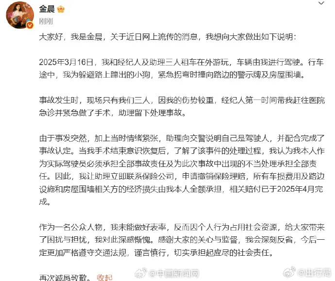金晨承认了事件真实性,因为事故突然慌乱之下出现了顶包的问题,后续已经全部自掏腰包赔偿