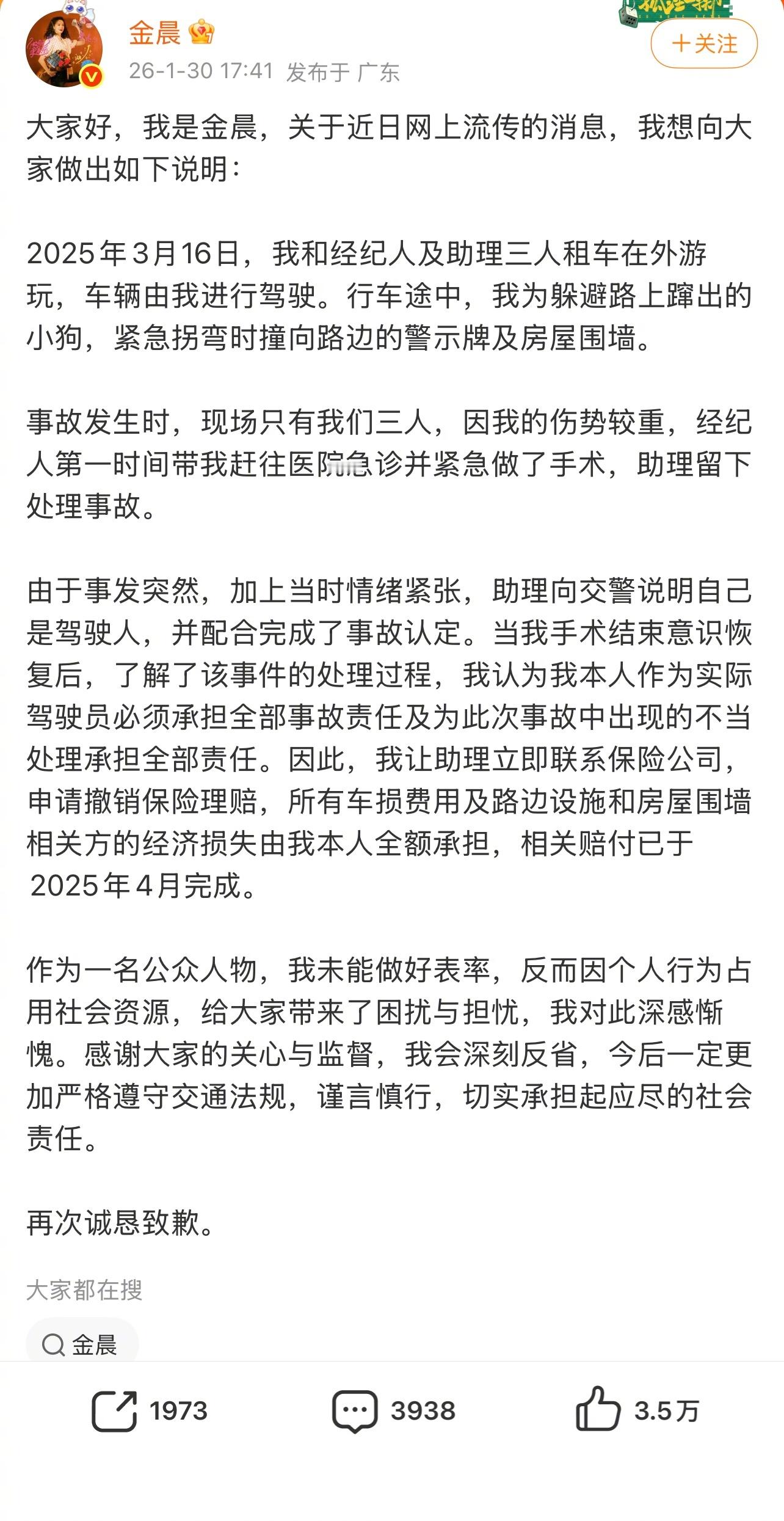 金晨回应称,当天她驾车带经纪人和助理出行时,为躲避突然蹿出的小狗,车辆失控撞向路边警示牌及农户围墙。事故后,她因伤势较重被经纪人紧急送医手术,助理则留在现场处理后续事宜。助理因紧张谎称自己是驾驶人,并配合交警完成事故认定。
