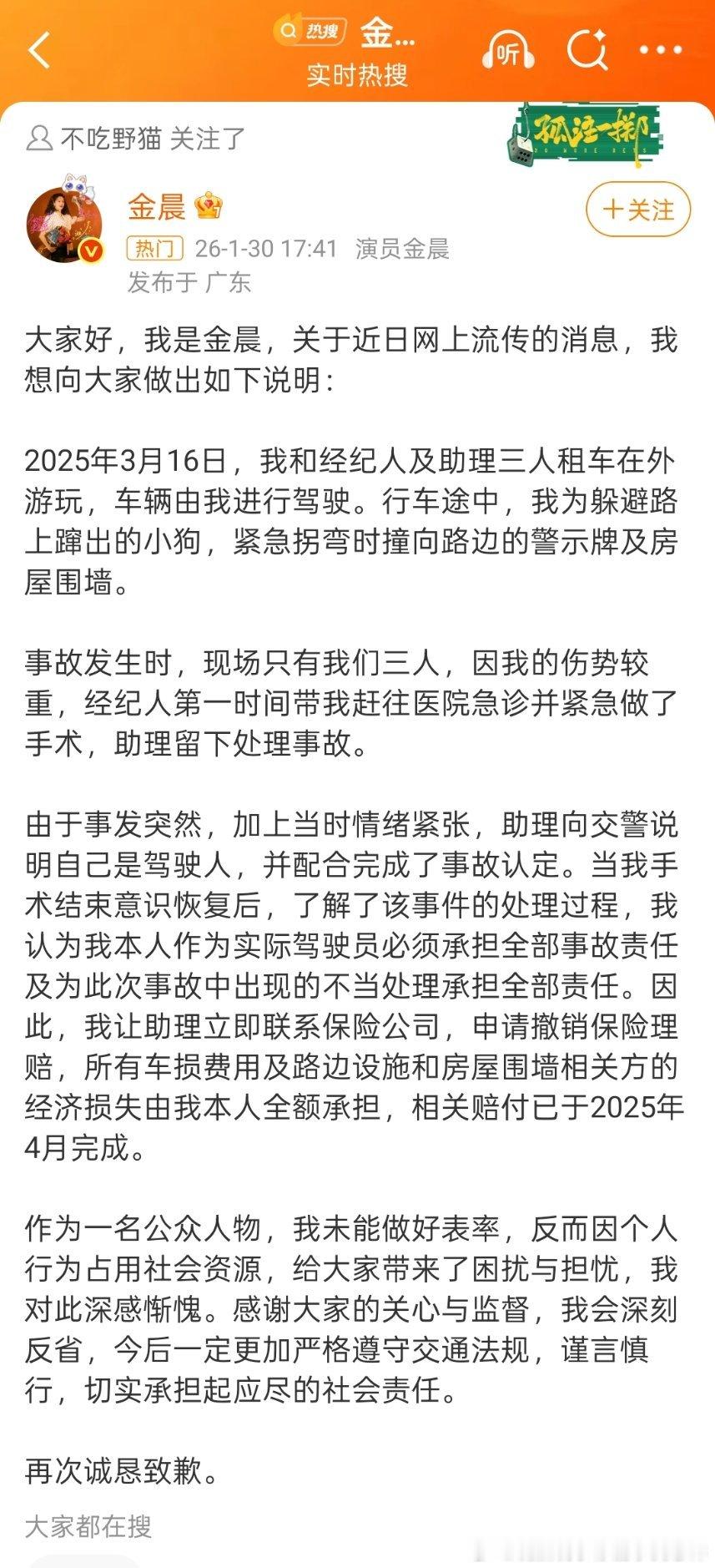 金晨发文道歉,说明自己当时因强势过重,先去就医并紧急进行了手术,后得知助理说是自己驾驶,去保险公司撤销了保险理赔。