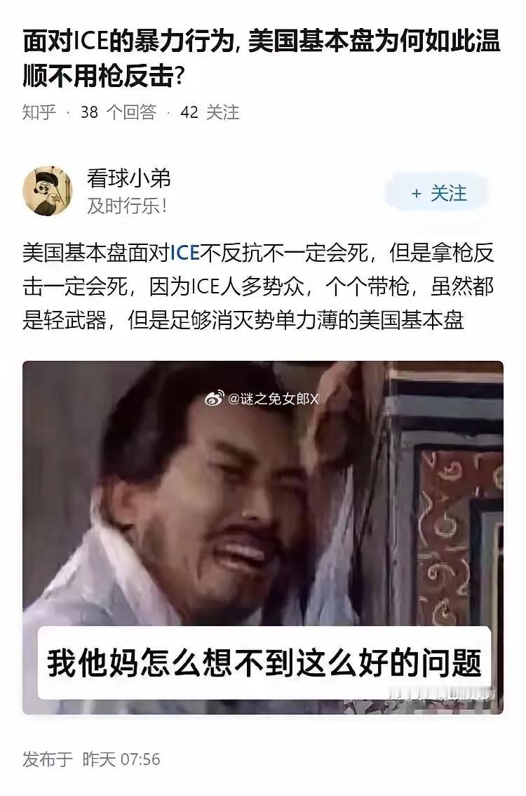 哈哈哈,面对ICE,美国全民持枪为何不敢用枪反击?除非他们不想死地更快。 美国基本盘不反抗可能不会死,用枪反抗,会瞬间被击毙! 不要忘了,ICE是一群拿制式自动轻武器的美国人,一群人对着一个拿点口径武器的基本盘,除非基本盘不想死的快!大声吼叫以争取引起路人注意,这是他们唯一可以做的!