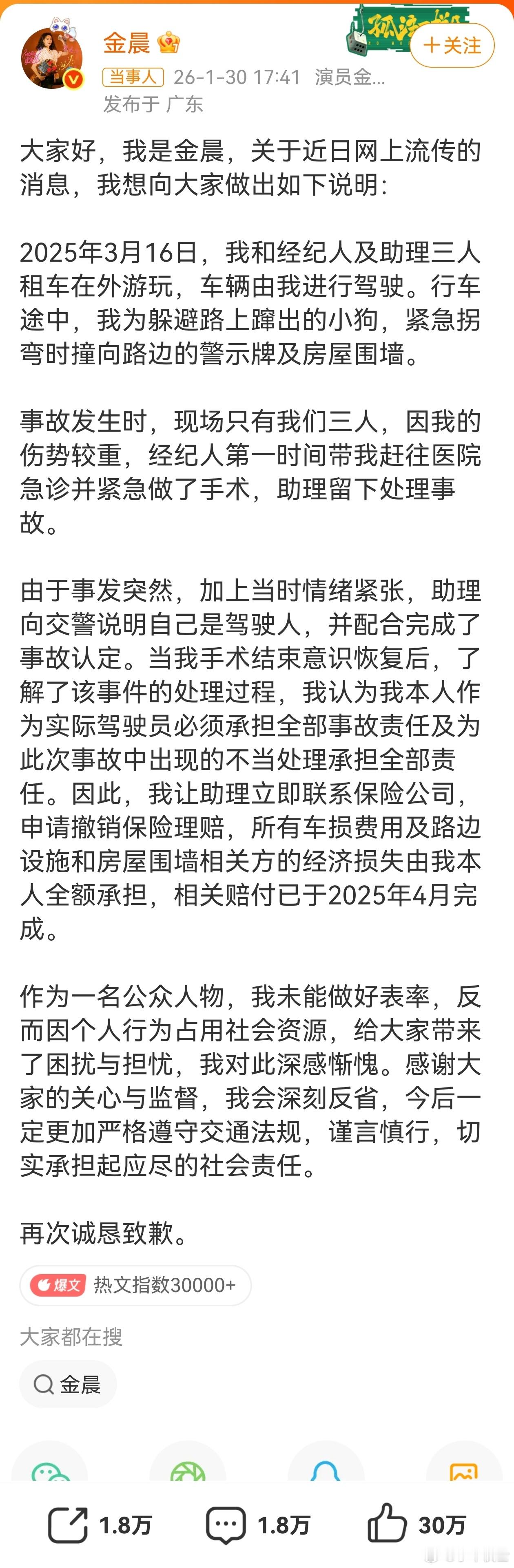 #金晨称相关赔付已于去年4月完成#【#金晨发文说明事故情况#】大家好,