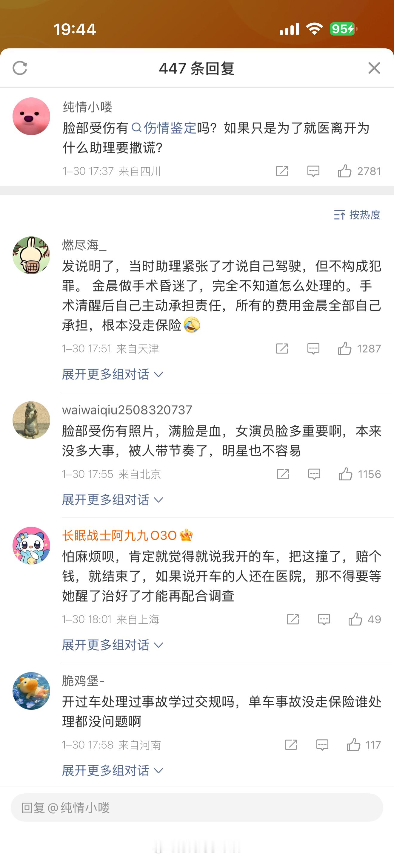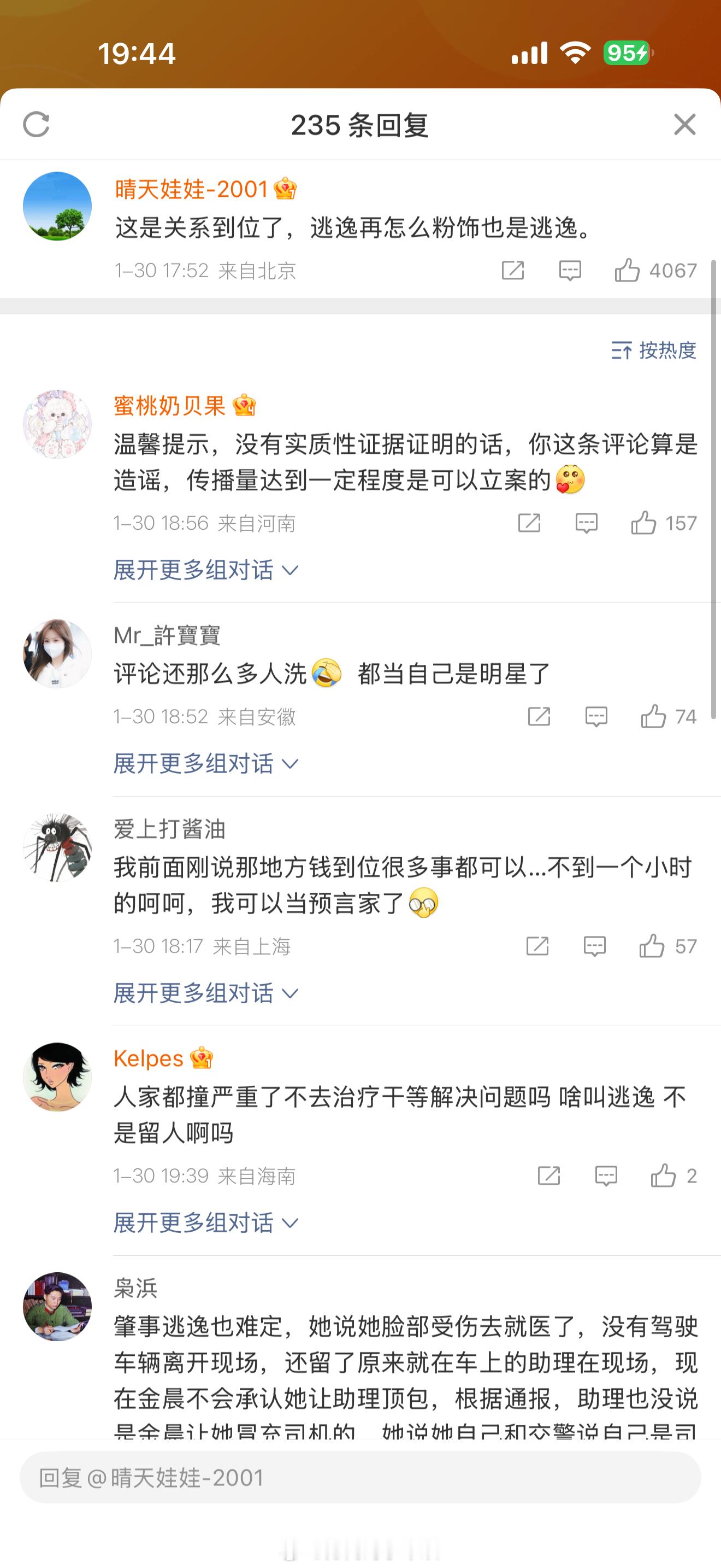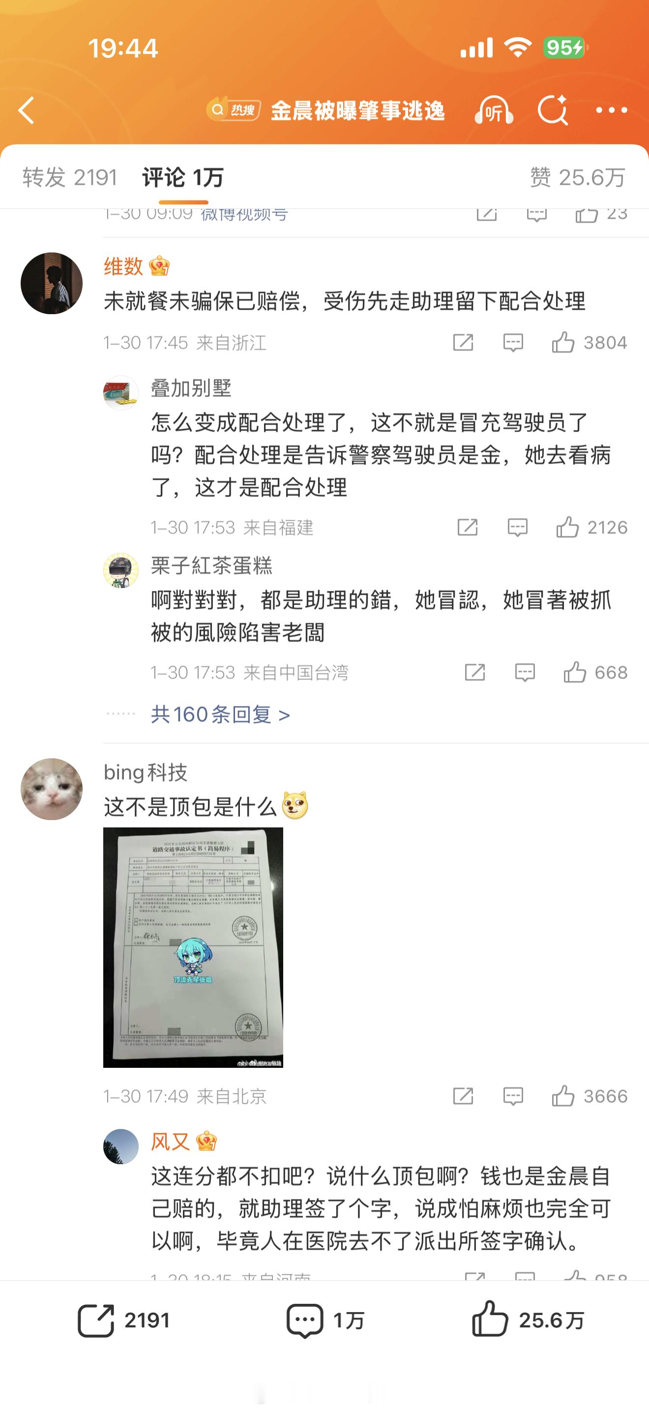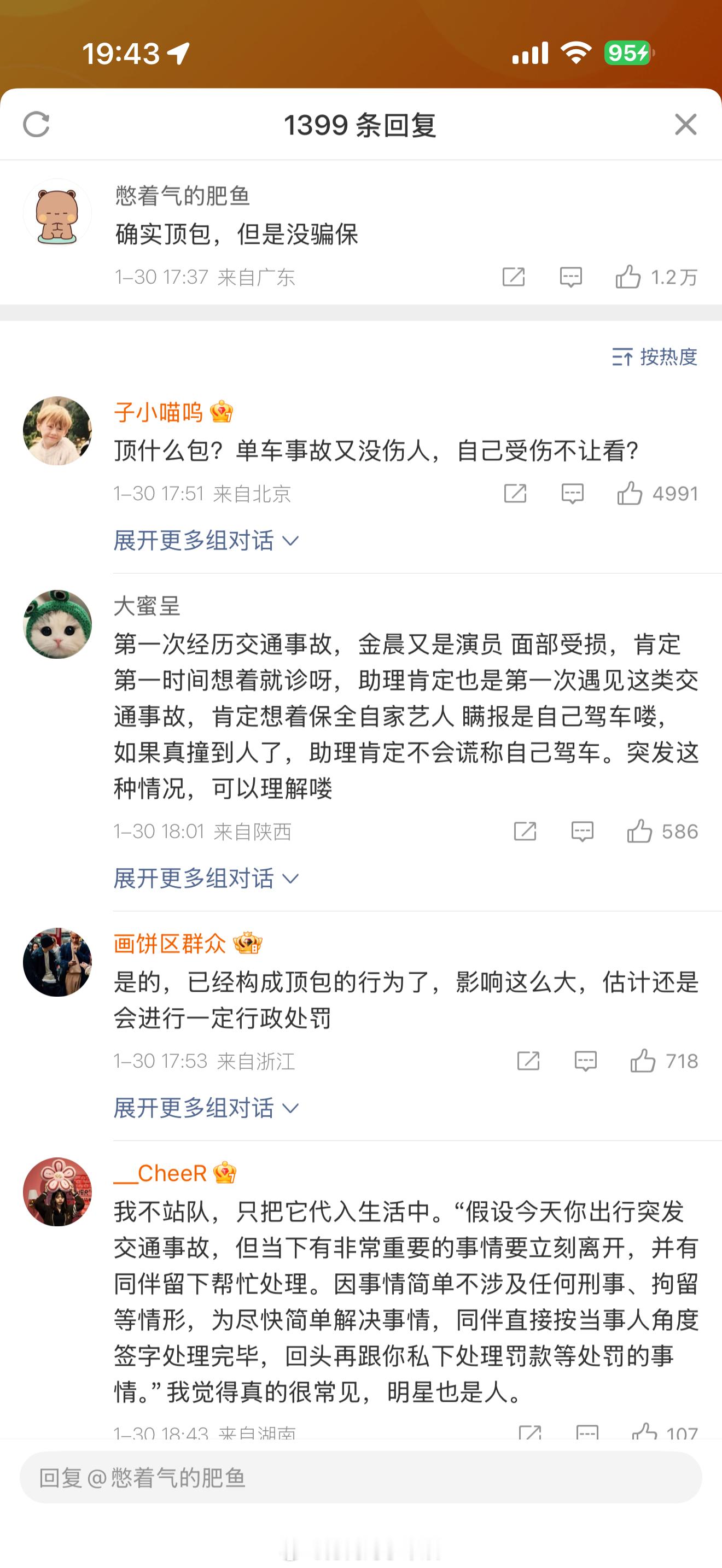金晨的粉丝有点下限吧!!!你们为了维护金晨,颠倒黑白,不分是非。既然是交通事故,当时有没有报警?报警后为什么还说不是自己驾驶的?这分明就是肇事逃逸嘛。既然顶包,那你当时有没有喝酒?是不是酒后驾车,这些都已经无从查证了。但肯定就是违法了。无论你怎么赔偿,做错了就是做错了,你不要再给自己洗白了,冒名顶替这个事,没得洗,真的没得洗。你们老实老实吧,下面的评论都是什么啊!!!别再给金晨招黑了,她就是做错了。希望法律可以严惩,尤其是公众人物。警方通报金晨事件