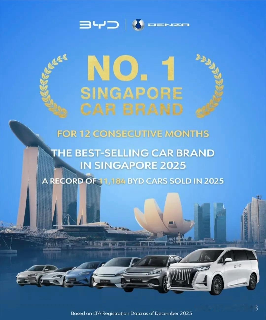新加坡市场,比亚迪力压丰田夺冠 2023年,丰田销量7248辆,比亚迪销量1416辆 2024年,丰田销量7876辆,比亚迪销量6191辆 2025年,丰田销量7466辆,比亚迪销量11184辆 在新加坡市场,比亚迪实现历史性突破,2025年全年销量达11184辆,成为新加坡历史上首个年度销量破万的汽车品牌。即使长期处于第一的丰田也没有做到,2025年市占率高达21.2%,不仅断档式领先丰田、宝马等传统豪强夺得年度销冠,更创下连续12个月环比增长的行业纪录, 比亚迪以三年持续跃升的强劲势头,重塑新加坡汽车市场格局,不过目前日系车依旧在新加坡是市占率最高,希望2026年继续努力。