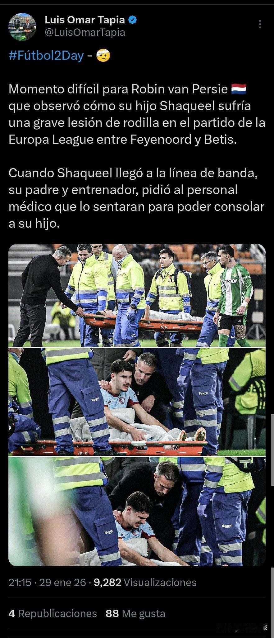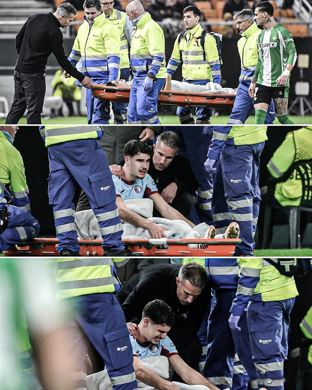 范佩西儿子大伤…当爹的估计心都碎了。 在费耶诺德对阵皇家贝蒂斯的欧联杯比赛中,罗宾·范佩西目睹儿子沙奎尔膝盖严重受伤。 当沙奎尔被搀扶到场边时,范佩西瞬间忘记了自己作为教练的身份,在看见儿子被安置在担架上时,他本能地扮演起父亲的角色,请求医疗人员将儿子扶坐起来,以便能亲自安慰他……..