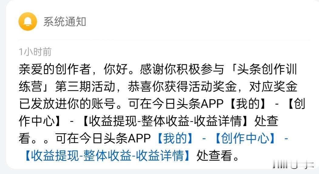 刚收到头条创作训练营第三期第一周的5块钱奖金啦,钱不多但是开心! 因为我一直专注写体育领域的内容,从湘超、滇超到欧冠,都是自己熟悉和喜欢的话题,所以这次完成同领域的任务特别顺利,拿奖金也挺轻松的。 钱不多,但这份肯定很暖心,接下来继续深耕体育内容,争取下次拿个更大的奖励!