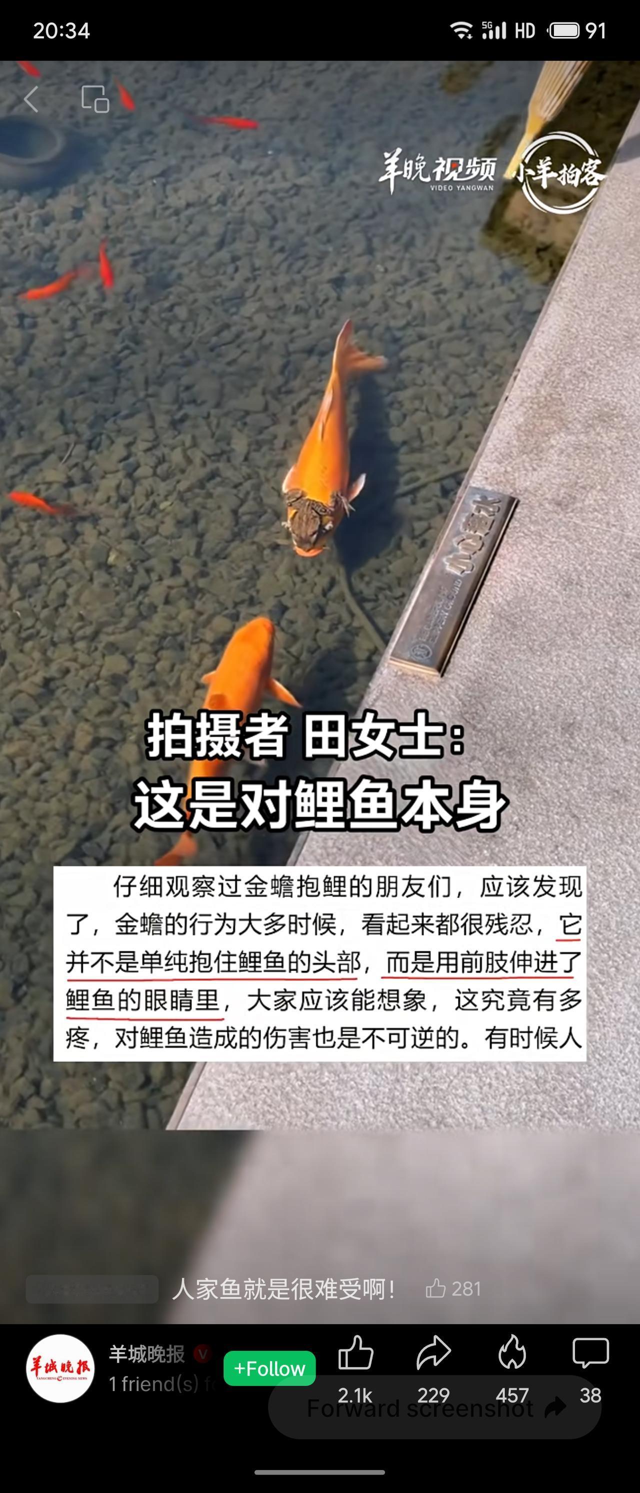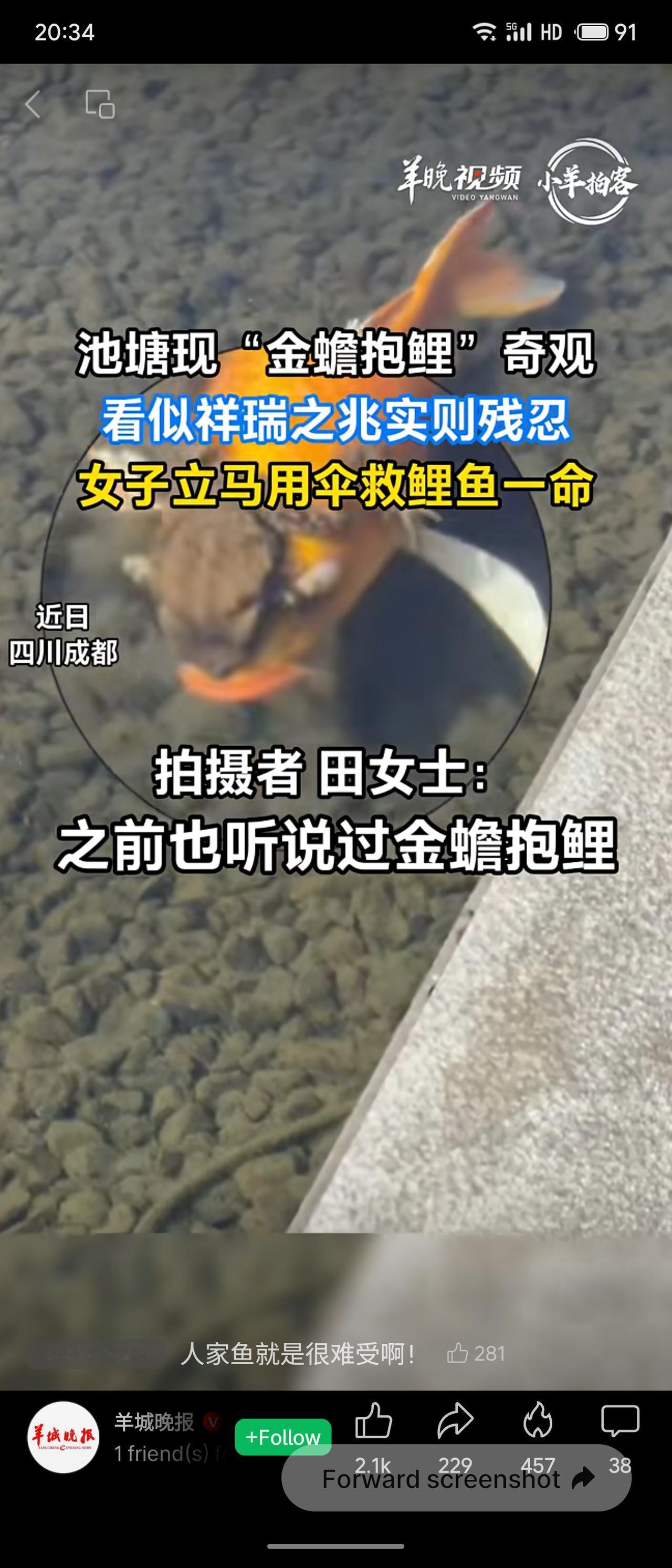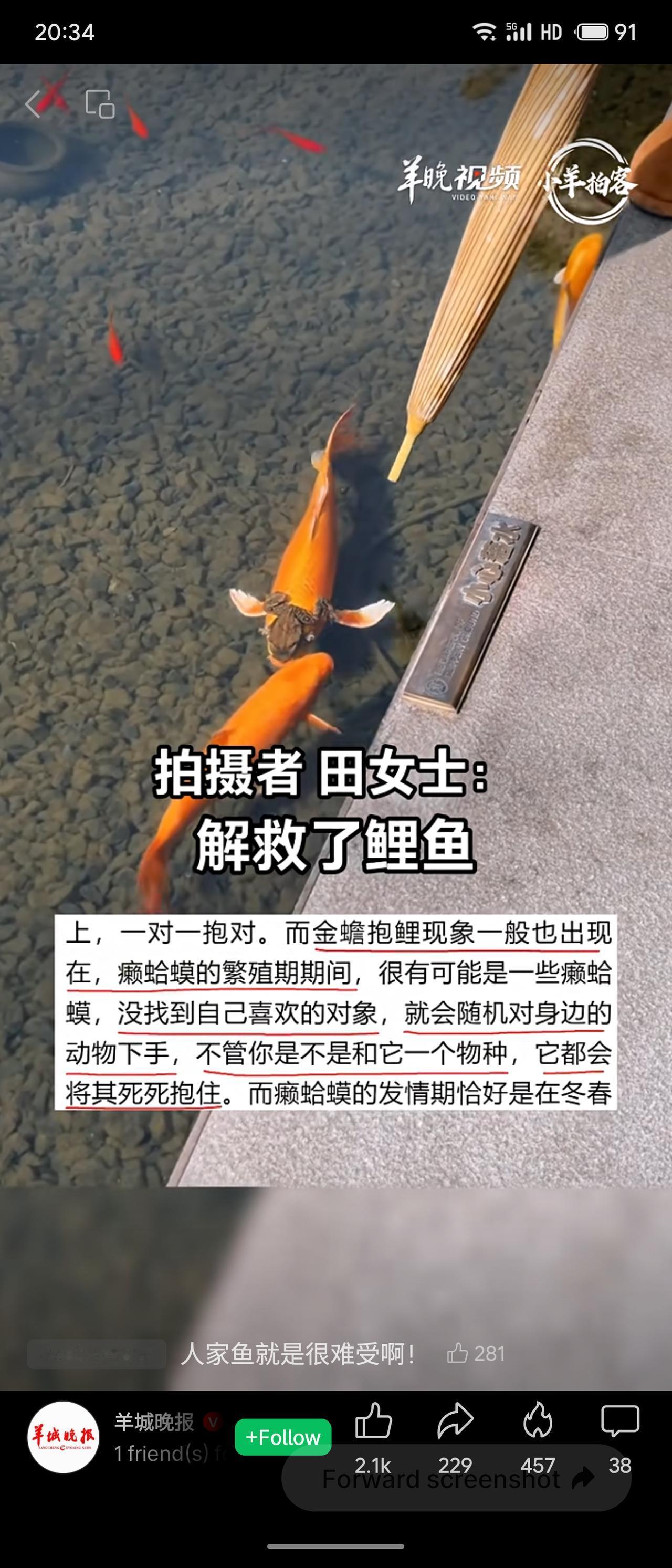 四川成都一池塘出现“金蟾抱鲤”现象,表面似祥瑞,实则金蟾将前肢伸入鲤鱼眼中,造成伤害。拍摄者田女士见状,立即用伞将鲤鱼救下。该现象源于癞蛤蟆繁殖期可能误将其他动物当作交配对象。