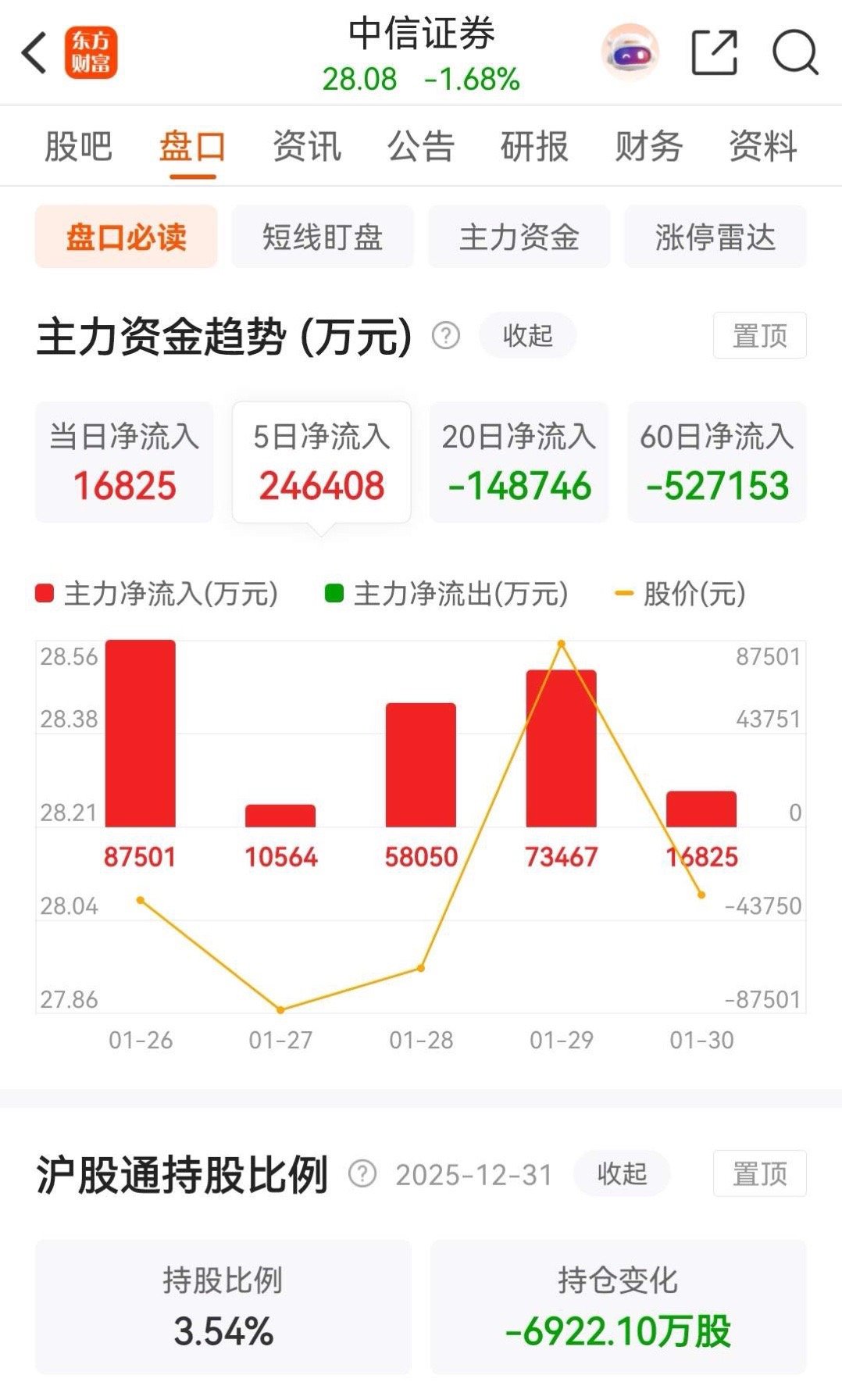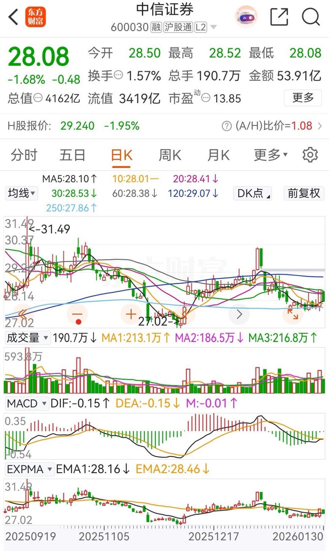 中信证券今天的走势同东财一样,全天的跌幅为1.68%,收盘报价28.08元。在资金流向上,连续五天被主力资金净买入,今天的净买入额为1.6825亿元,本周的累计净买入额为24.6408亿元 ,总金额还是比较大的。从走势上看,今天的这根阴线,再次破坏了逐渐向好的走势形态,关键就看下周一的走势了。另外,截止今天收盘为止,中信证券在今年第一个月的涨幅为-2.19%,而东方财富则为-2.07%。至于更加详细的技术分析,可以查看上一篇中关于券商概念板块走势的分析。