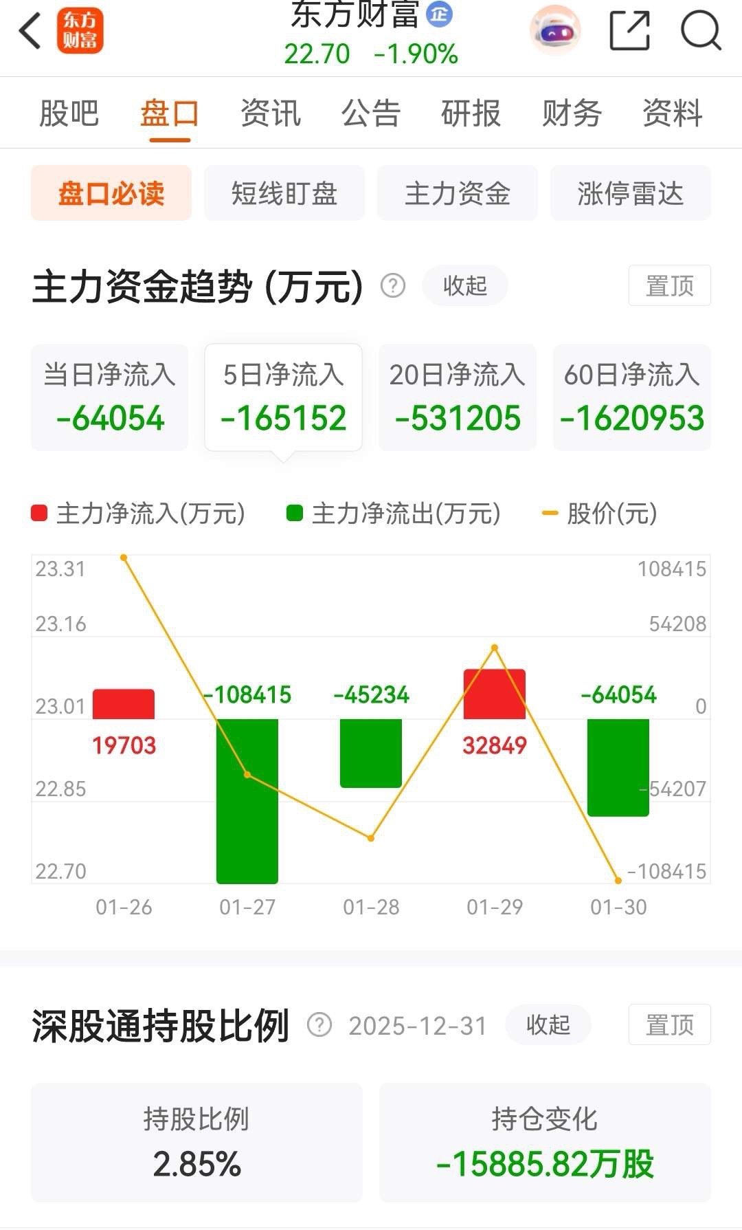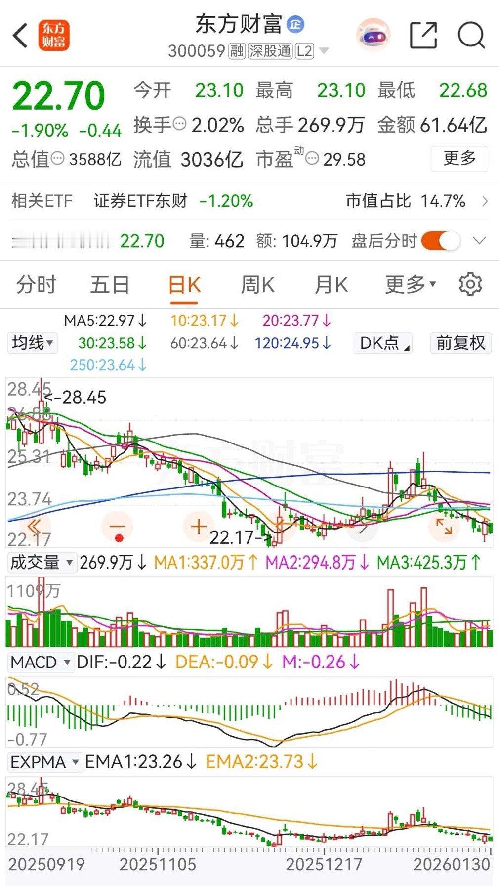 东方财富和中信证券今天低开低走,分别下跌了1.9%和1.68% ,而中信证券则是连续五天被主力资金净买入。东方财富今天早盘直接低开后一路下行,打出全天最低点后开始回升,反弹后再次回落,基本以最低价报收,收盘时的跌幅为1.90%,收盘报价为22.70元。在资金流向上,今天被主力资金净卖出6.4054亿元,本周有两个交易日在净买入,而本周的被主力资金合计净卖出的金额约为16.5152亿元 。从走势上看,整体上依然是处于破位态势之中!