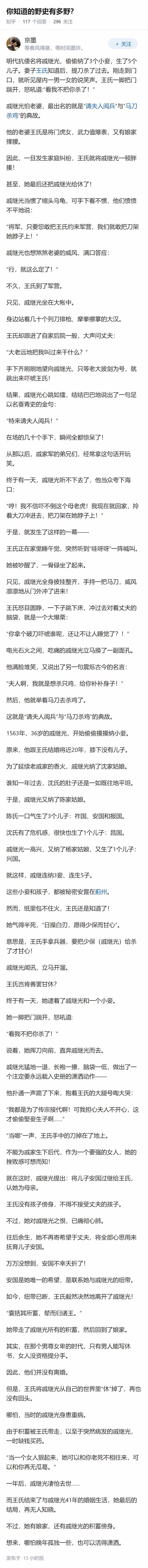 关于戚继光“怕老婆”的野史,真不真暂且不论,但是确实够野!一直以为戚继光是抗倭名将,也算是挺光明正大的人物,没想到竟然还有一个“怕老婆”的另类人生! 确实“特来请夫人阅兵”“提马刀杀鸡为夫人补补身子”“又是扑通跪地抱着夫人大腿痛哭,纳妾生子只为家族传宗接代”的悲情表演,哈哈哈,如此也真是笑人。 感觉戚继光的“怕老婆”是真怕,怕的也有点可爱!不过最后没想到他被夫人休了,穷困潦倒而终,多少有点让人遗憾!