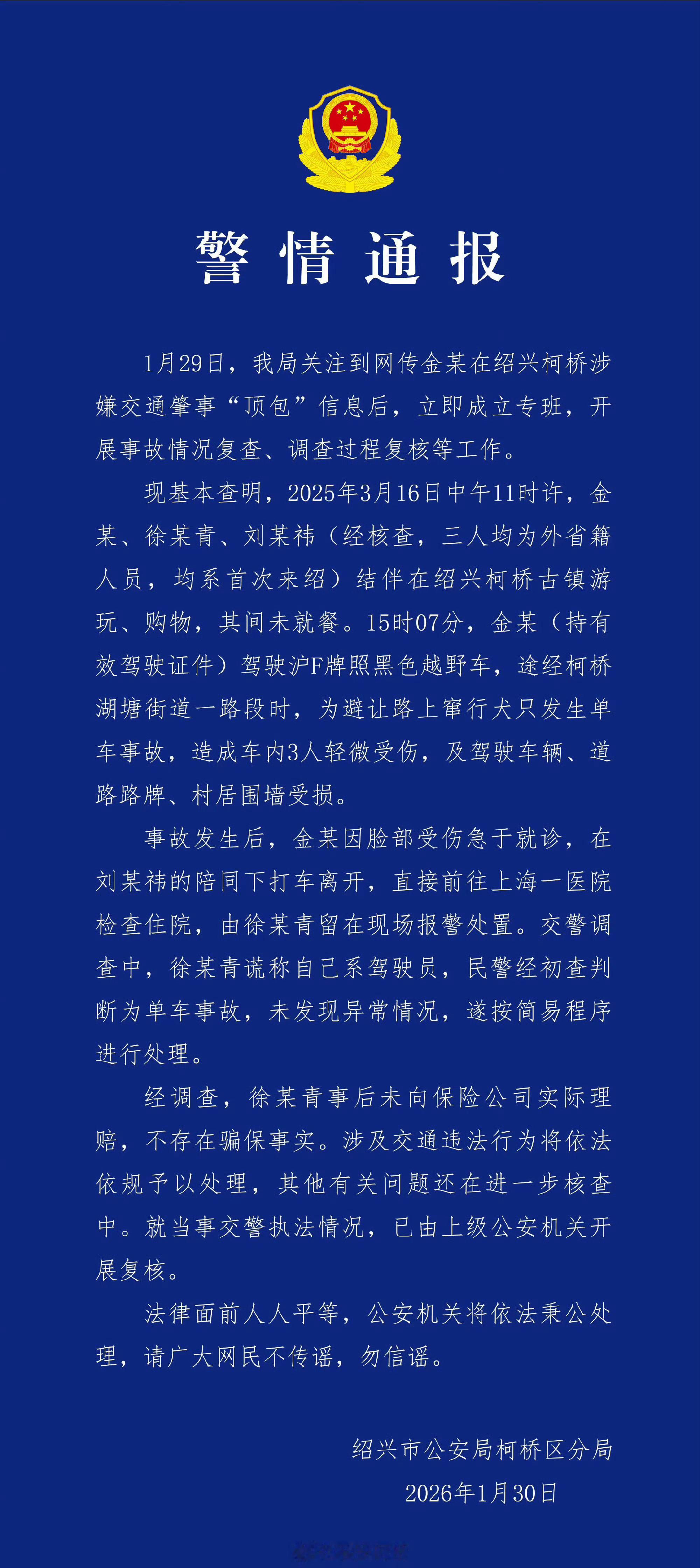 警方通报金晨事件估计助理是自愿顶包的,不存在骗保行为!也算是英勇救主了吧,蓝底白