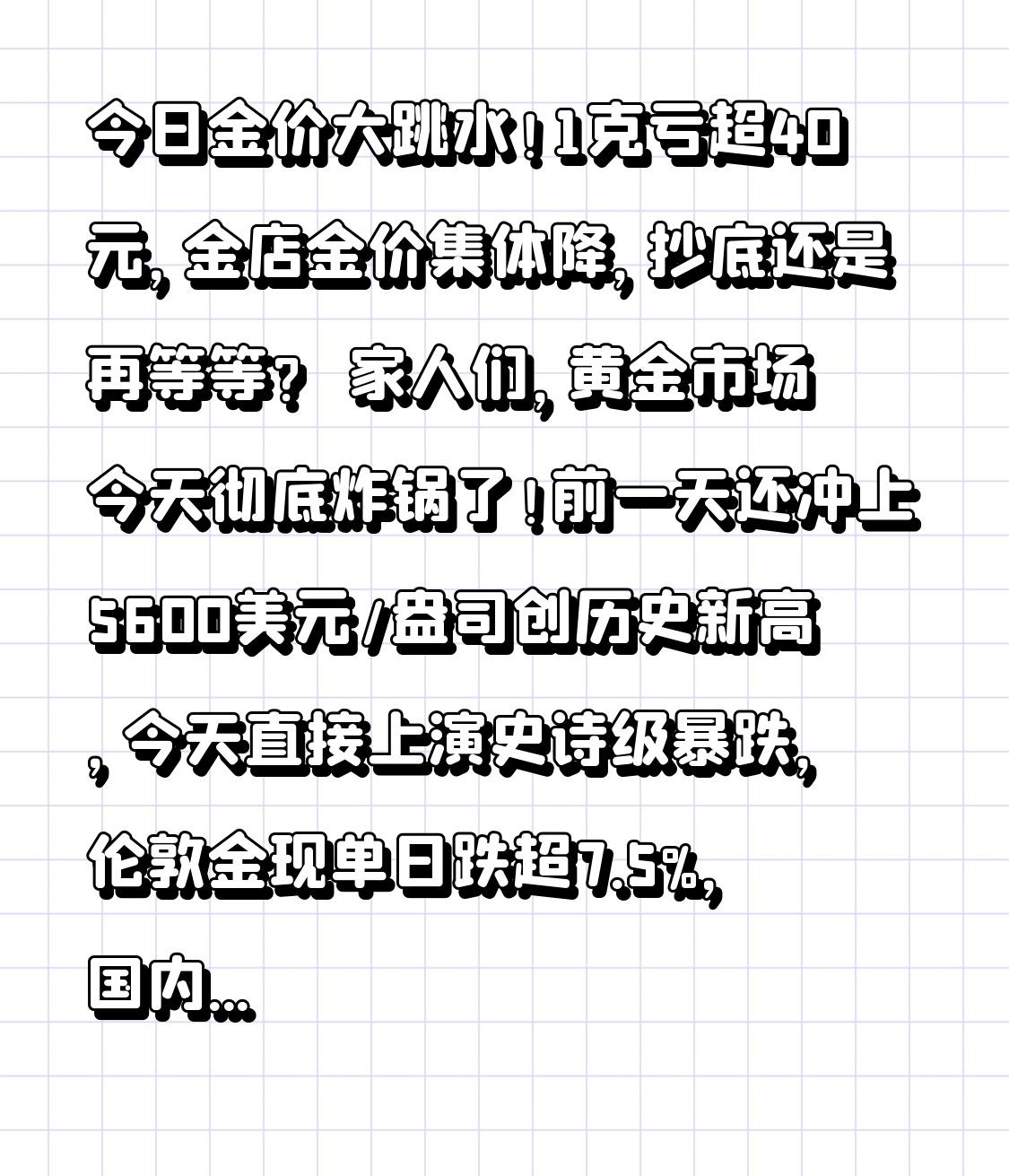 今日金价大跳水!1克亏超40元,金店金价集体降,抄底还是再等等? 家人们,黄金市场今天彻底炸锅了!前一天还冲上5600美元/盎司创历史新高,今天直接上演史诗级暴跌,伦敦金现单日跌超7.5%,国内黄金T+D1克就跌了近50元,连周大福、老凤祥这些金店的金价也集体下调,最高一克降了25块,手里有黄金的朋友直呼心脏受不了! 今早一开盘,贵金属市场就一片绿,沪金主连跌超5%,白银跌得更狠,T+D跌幅直接破13%,A股黄金股更是扎堆跌停,买了黄金基金、黄金股的散户,评论区全是哀嚎:“刚追高买了100克投资金,一天亏掉4000多”“黄金股直接封死跌停,想割肉都跑不了”“本来想靠黄金过年赚点红包,现在倒贴进去一个月工资”。 很多人都懵了,昨天还涨疯的黄金,怎么一夜之间就崩了?其实这波暴跌不是偶然,背后三个原因很关键。一是金价前期涨太猛,开年涨了近30%,大量获利资金见好就收,集中抛售引发踩踏;二是芝商所第四次上调黄金保证金比例,杠杆玩家没钱补仓只能被迫平仓,越抛越跌;三是市场避险情绪降温,特朗普计划和伊朗对话,叠加鹰派人士或出任美联储主席的消息,美元短线反弹,压制了黄金价格。 但重点来了!这波暴跌可不是黄金牛市的终结,而是关键的转折点,懂行的人都知道,黄金长期上涨的逻辑根本没断!全球央行还在疯狂增持黄金,美元信用弱化的趋势改不了,地缘政治的风险也还在,就连瑞银都直接上调黄金目标价到6200美元/盎司,比现在的价格还要高20%。说白了,这次大跌就是一次“健康的深蹲”,是给普通投资者的一次上车机会。 那现在最关键的问题,手里有黄金的该怎么办?想入场的能抄底吗?记住这三点就够了:第一,别恐慌割肉,手里的实物金、低仓位黄金基金拿着就好,短期波动很正常;第二,别盲目抄底,更别碰黄金期货、T+D这些杠杆产品,小心血本无归;第三,真想入场就分批买,选银行投资金条或者黄金ETF,成本低还靠谱,仓位别超过总资产的15%。 其实炒金和做人一样,别追涨杀跌,更别想着靠黄金一夜暴富。黄金从来都不是投机的赌具,而是家庭财富的“压舱石”,是用来抵御风险、保值增值的。不管市场怎么波动,守住自己的节奏,不贪心、不恐慌,才能在投资里稳赚不赔。 今日金价大跌,你是打算抄底还是观望?手里的黄金是扛着还是割肉?评论区聊聊你的看法,也转给身边买了黄金的朋友提个醒!