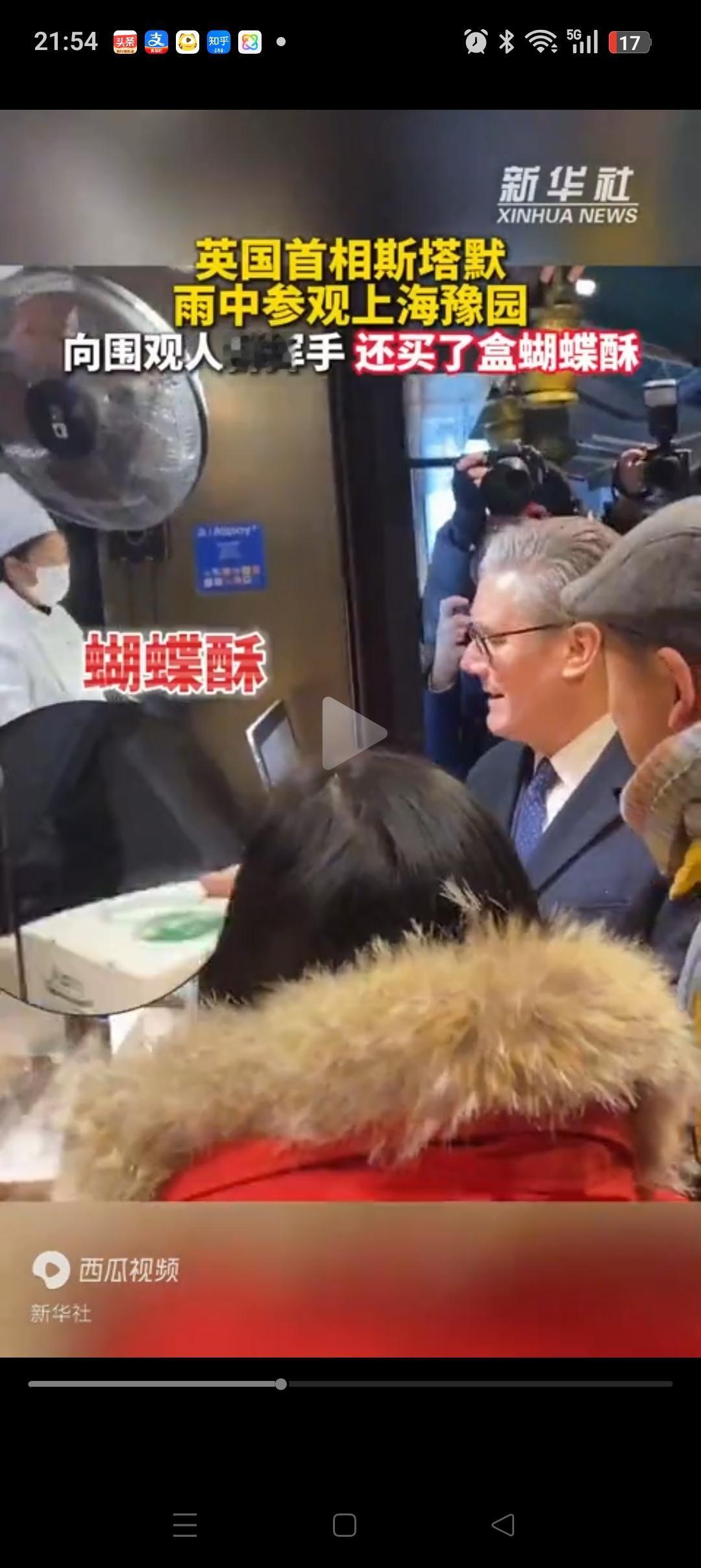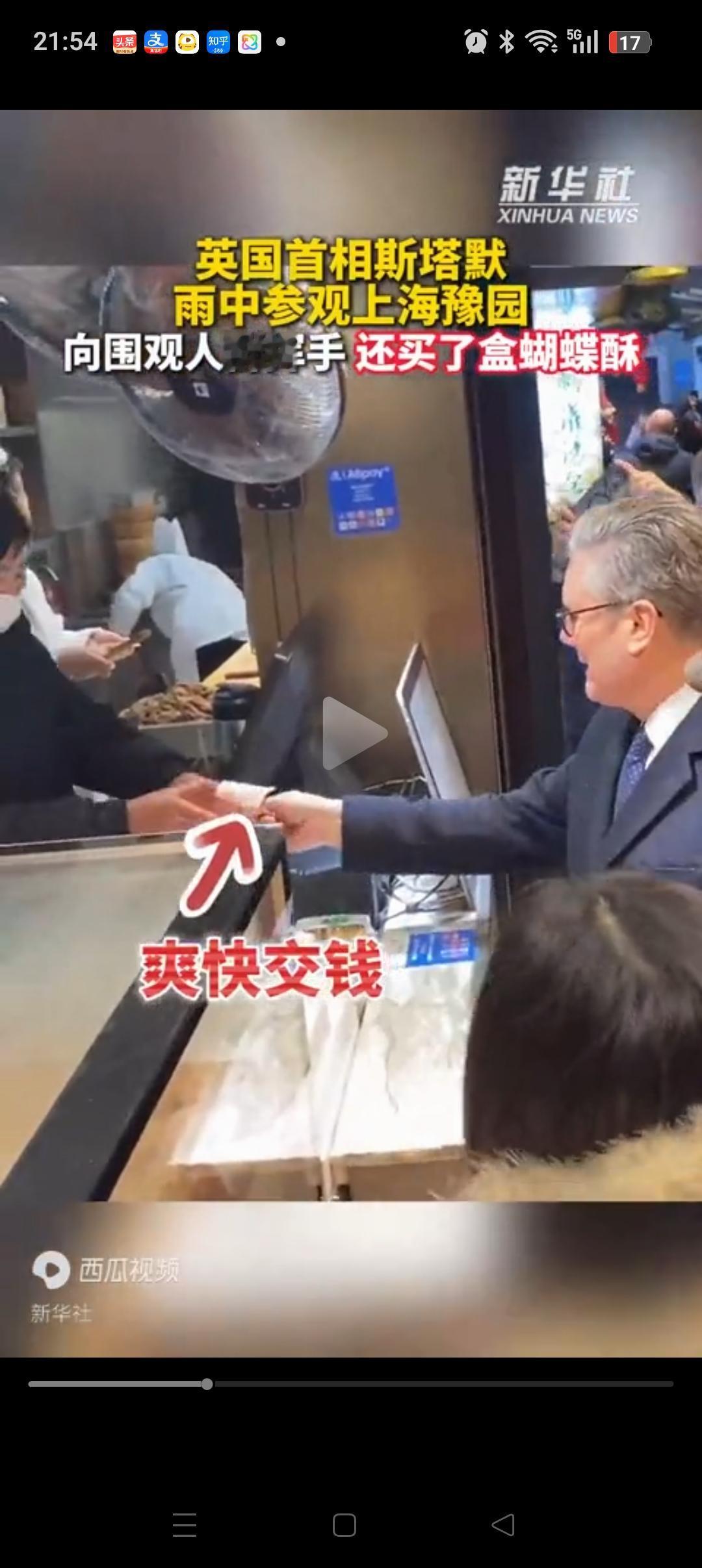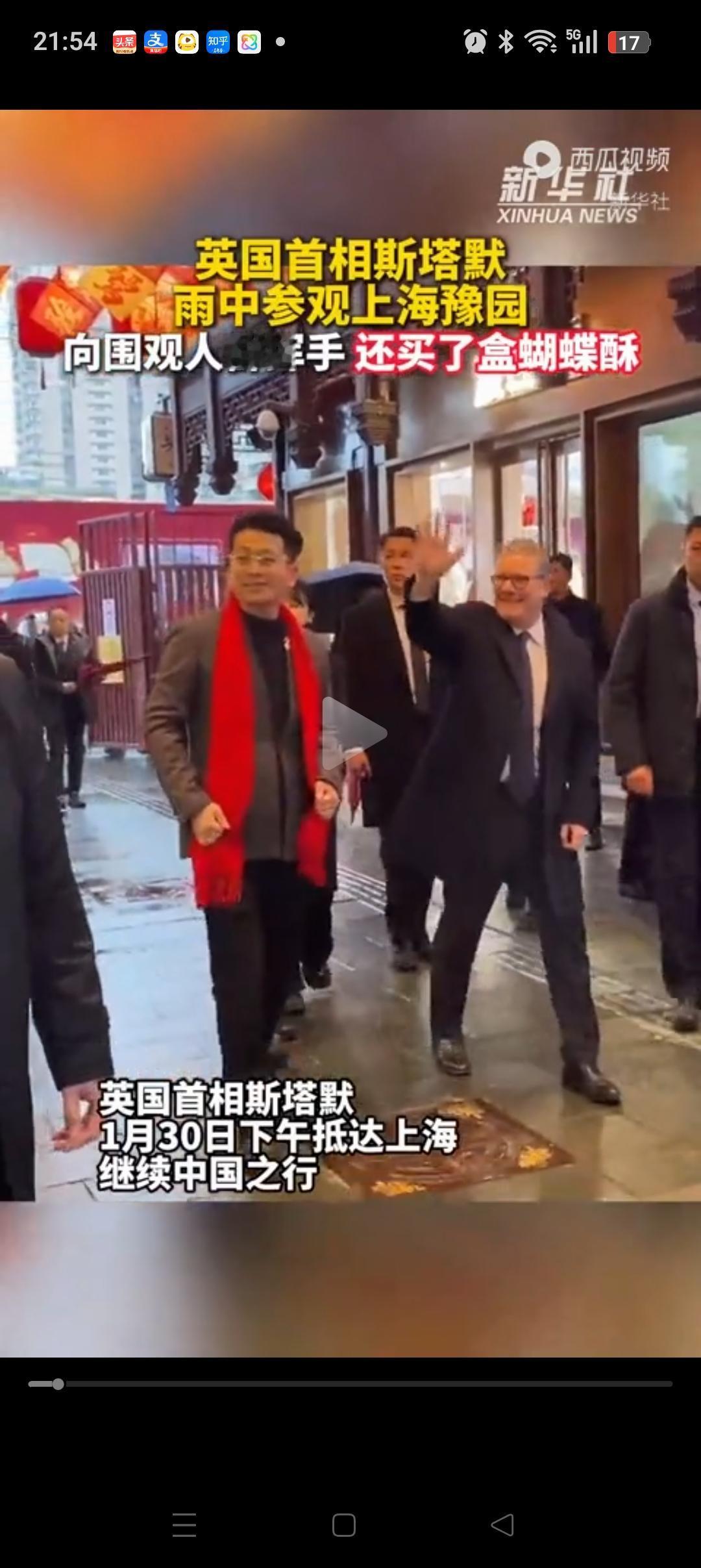 斯塔默在上海糕点店买蝴蝶酥,居然用的是红钞票,还是自己亲自付款。可见他早有准备,提前找工作人员要的。因为英国没有移动支付的习惯,习惯了用现金。 拿到自己的蝴蝶酥后,他还大方的给别人展示自己的东西,显然很满意。 不得不说上海的天气和英国真的很像,都是有小雨。斯塔默也很适应,全程不打伞,逛了一路豫园,最后还去喝了一杯茶。 这一趟上海之行,斯塔默收获满满,希望他玩的开心[玫瑰][玫瑰]