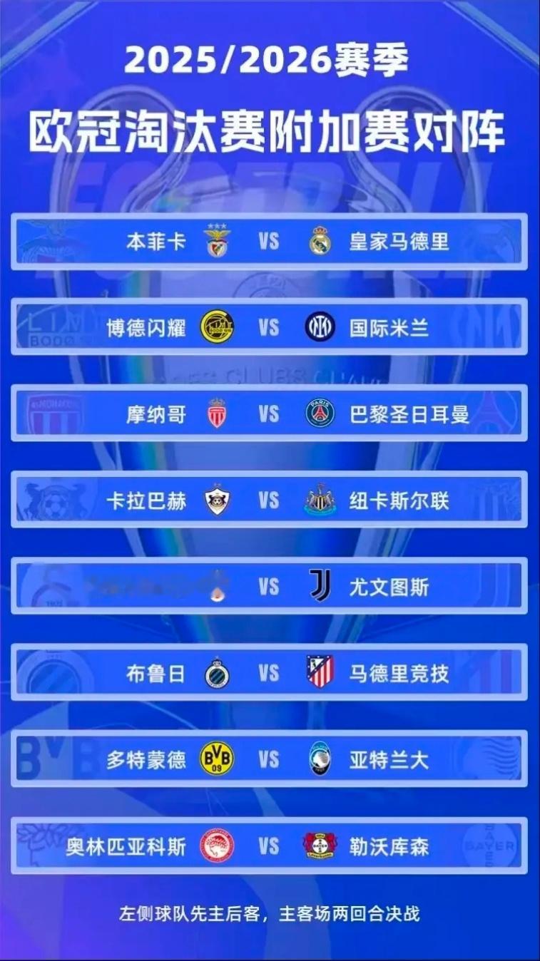 欧冠附加赛对阵出炉:穆帅率队再战皇马 英超6队锁定16强在望2025-26赛季欧冠淘汰赛附加赛抽签结果新鲜出炉,多组对决看点拉满:穆里尼奥执教的本菲卡将再战旧主皇马,纽卡斯尔抽得上上签,英超阵营此番有望实现6队晋级欧冠16强的盛况。欧冠淘汰赛附加赛完整对阵(种子队在后,客队先主后客):本菲卡vs皇马:堪称冤家再聚首,欧冠联赛阶段末轮本菲卡曾4-2击败皇马,前者压线晋级、后者位列第九无缘直通。穆帅率队再战旧主,此番重返伯纳乌成为最大看点,皇马想要晋级仍需全力应战。博德闪耀vs国际米兰:博德闪耀联赛阶段曾爆冷击败曼城、马竞,但整体实力与国米差距明显,蓝黑军团抽得上上签。摩纳哥vs巴黎圣日耳曼:迎来法甲内战,摩纳哥硬实力不及巴黎,此番对决晋级难度颇大。卡拉巴赫vs纽卡斯尔联:纽卡斯尔遇上阿塞拜疆球队,成为妥妥的上上签,这也让英超6队会师欧冠16强的愿景愈发清晰。加拉塔萨雷vs尤文图斯:两队实力旗鼓相当,斑马军团想要突围仍需拼尽全力。布鲁日vs马德里竞技:马竞向来以铁血防守著称,这场对决无论哪支球队取胜,都必将经历一番苦战。多特蒙德vs亚特兰大:堪称强强对话的进攻大战,两队将正面比拼进攻火力,看谁的锋线更犀利。奥林匹亚科斯vs勒沃库森:勒沃库森抽得好签,晋级前景一片光明。欧冠抽签