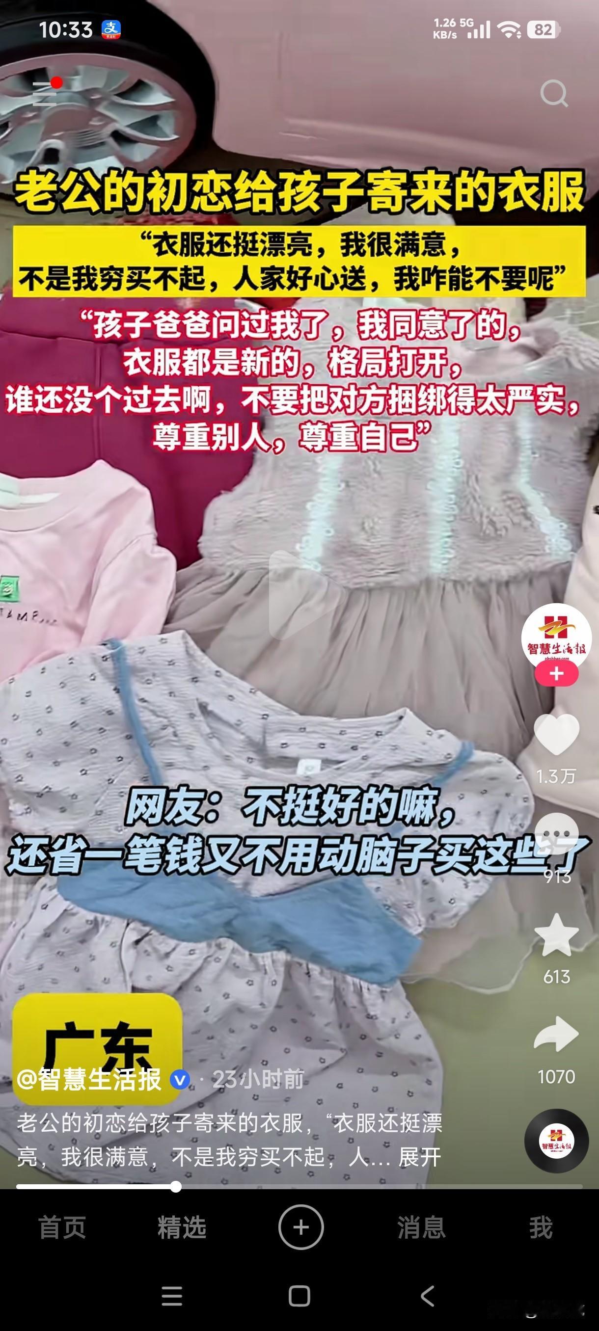 初恋可能人人都有,但如此暖心的初恋你有吗? 女子发视频炫耀老公的初恋给孩子寄来漂亮的衣服,她说并不是自己穷买不起,而是人家好心送她咋能不要呢,并且老公也问过她了,她是同意的,而且衣服全部是新的,谁还没有个过去,要把格局打开,不要把对方捆绑的太严实,尊重别人不也是在尊重自己吗? 不得不说现如今居然还有如此暖心的初恋,这真是让人羡慕至极,不像有的初恋分开后巴不得对方去死,而这位女子居然还给初恋的孩子买衣服,如此暖心的举动着实让人既羡慕又嫉妒,为什么暖心的初恋都是别人家的?而我的初恋当初因为父母的阻挠最终没有在一起,她把所有的原因都怪在我身上,只要我们村里死人了她就打听是不是我,不知道我的初恋现在过的好吗?不知道她还在人世吗?