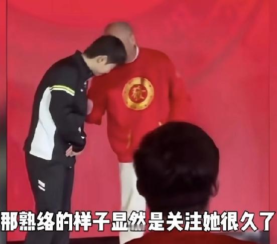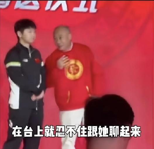 红双喜董事长李明,在台上就忍不住跟莎莎交流。 莎莎在展会现场,双手放前面 旁边是李明董事长,董事长先用眼睛向旁边看一眼,就忍不住靠近莎莎跟莎莎说话:“莎莎 你看这么多人都是因为你来了。” 莎莎:“伯伯您过奖了。” 李明:“待会活动结束后,能不能多签几个拍子,作为公司年终奖励。” 莎莎:“哈哈,可以可以伯伯。” 这场景太欢乐了!