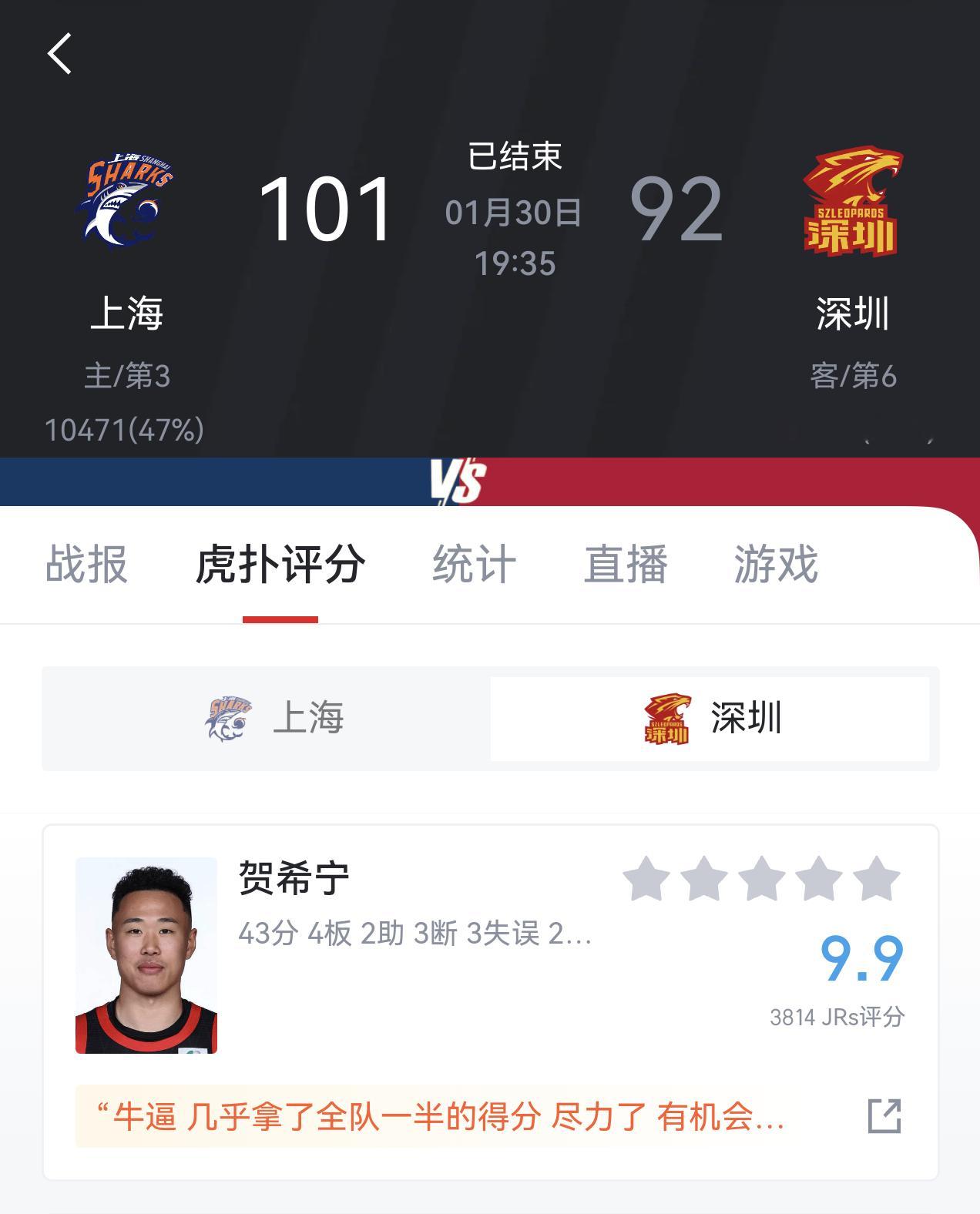 来吧讨论一下。单场43分4板2助,场均20.4分5篮板3.6助攻。合同年,休赛期想得到他,得多少个w贺希宁空砍43分 上海男篮vs深圳男篮