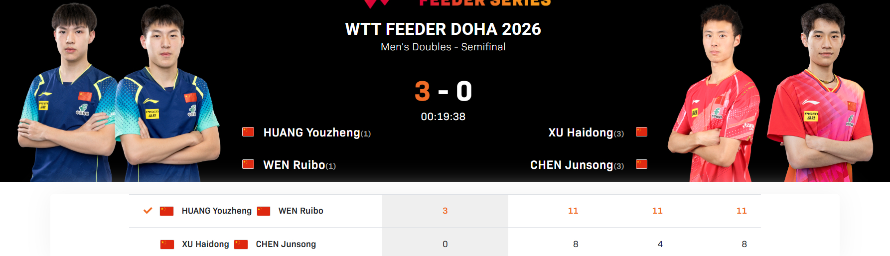 2026WTT支线赛多哈站男双半决赛,黄友政/温瑞博11-8、11-4、11-8战胜徐海东/陈俊菘,晋级决赛。