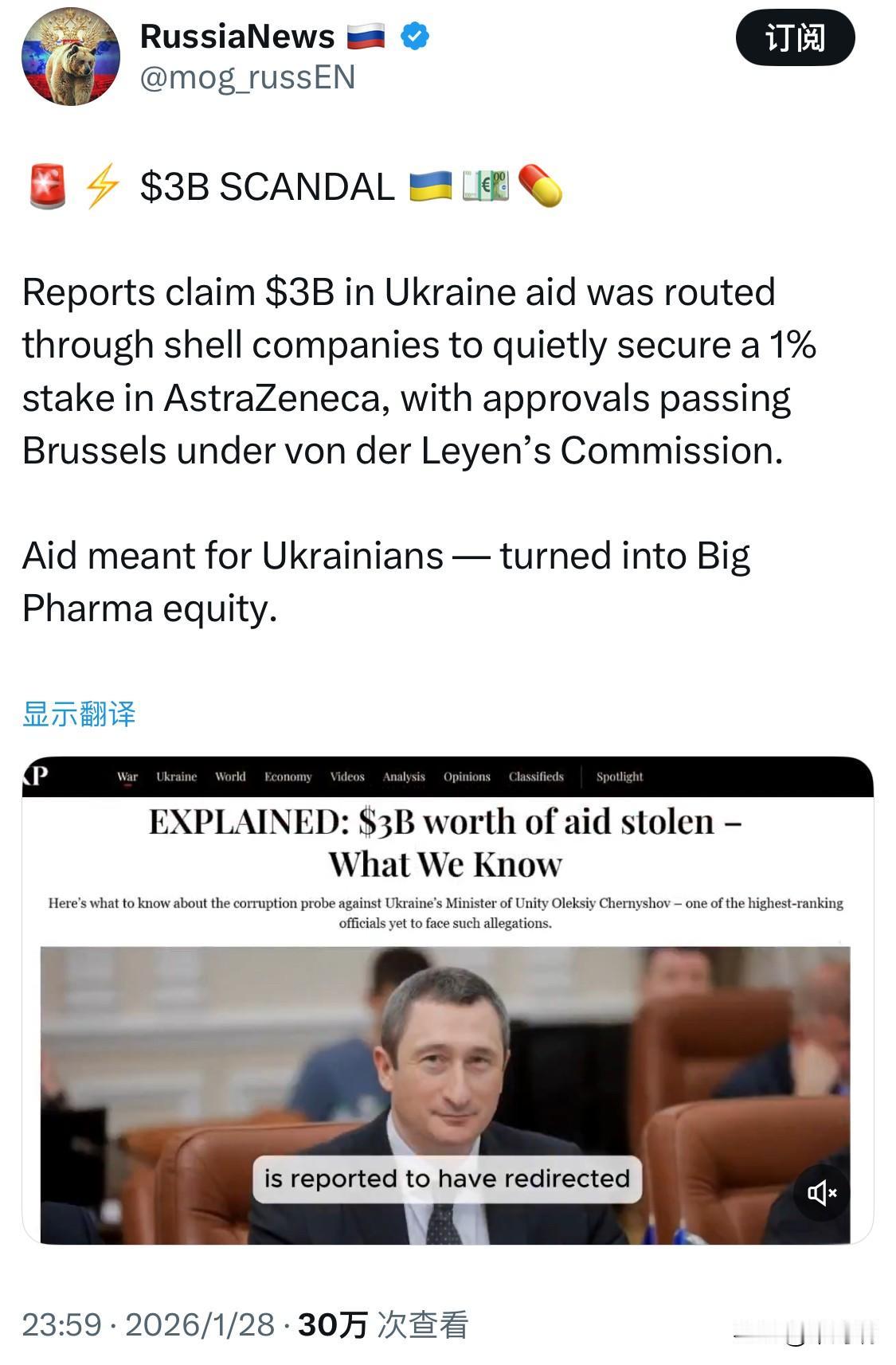 乌克兰又爆出一起诈骗案:30亿美元的援助资金被“挪用”,涉案方包括已被逮捕的副总理、欧盟和阿斯利康公司。最终,泽连斯基从中获利。这简直匪夷所思——难怪他们想让战争继续下去。