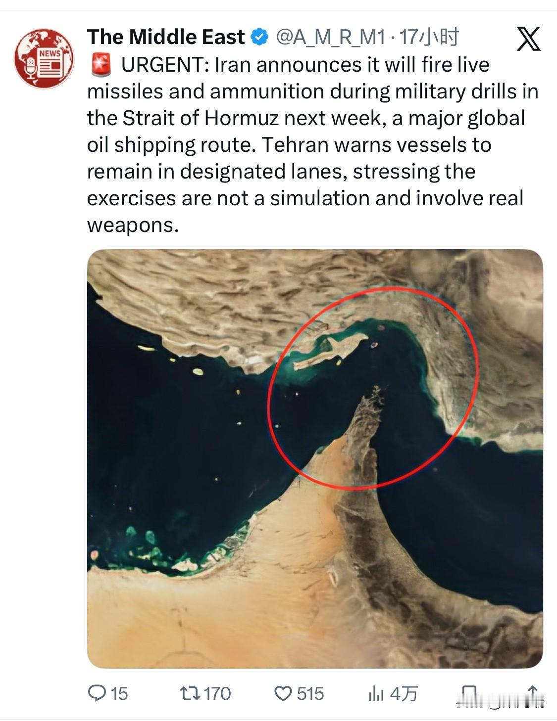 紧急:伊朗宣布将于下周在霍尔木兹海峡举行军事演习,届时将使用实弹导弹和弹药。霍尔木兹海峡是全球重要的石油运输通道。德黑兰警告船只留在指定航道,并强调此次演习并非模拟演习,而是使用真枪实弹。