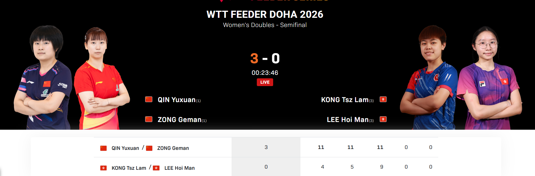 2026WTT支线赛多哈站女双半决赛,覃予萱/纵歌曼11-4、11-5、11-9战胜李凯敏/江芷林,晋级决赛。国乒提前锁定女双冠亚军。