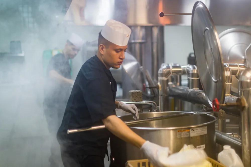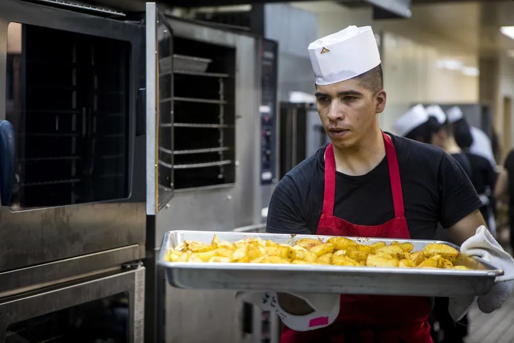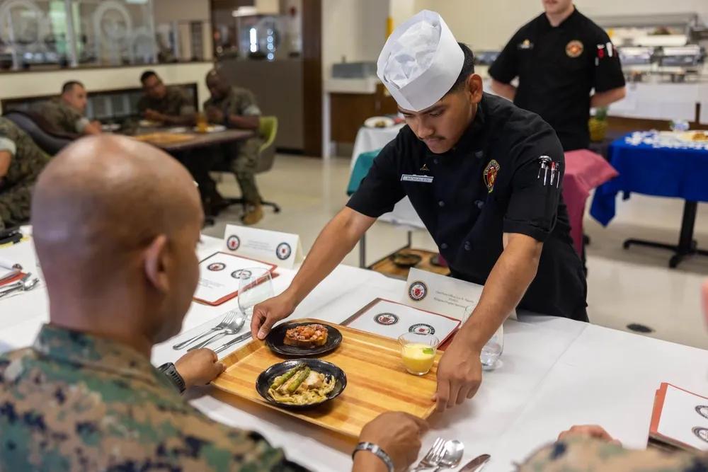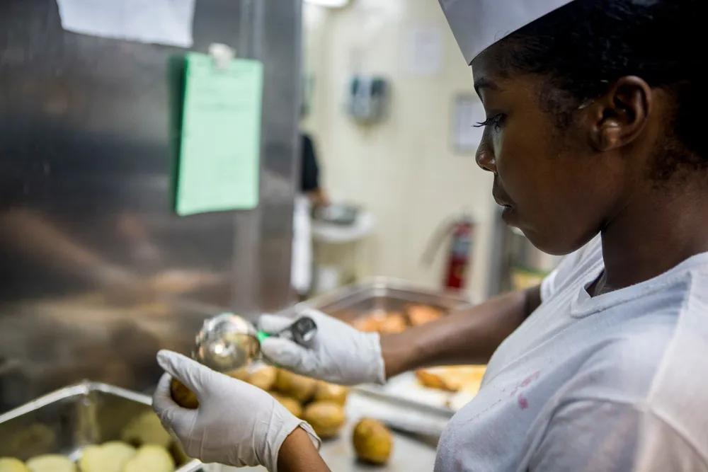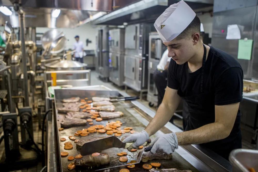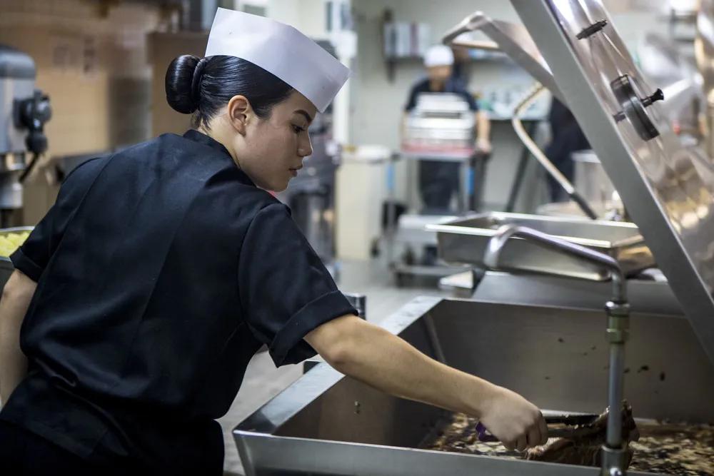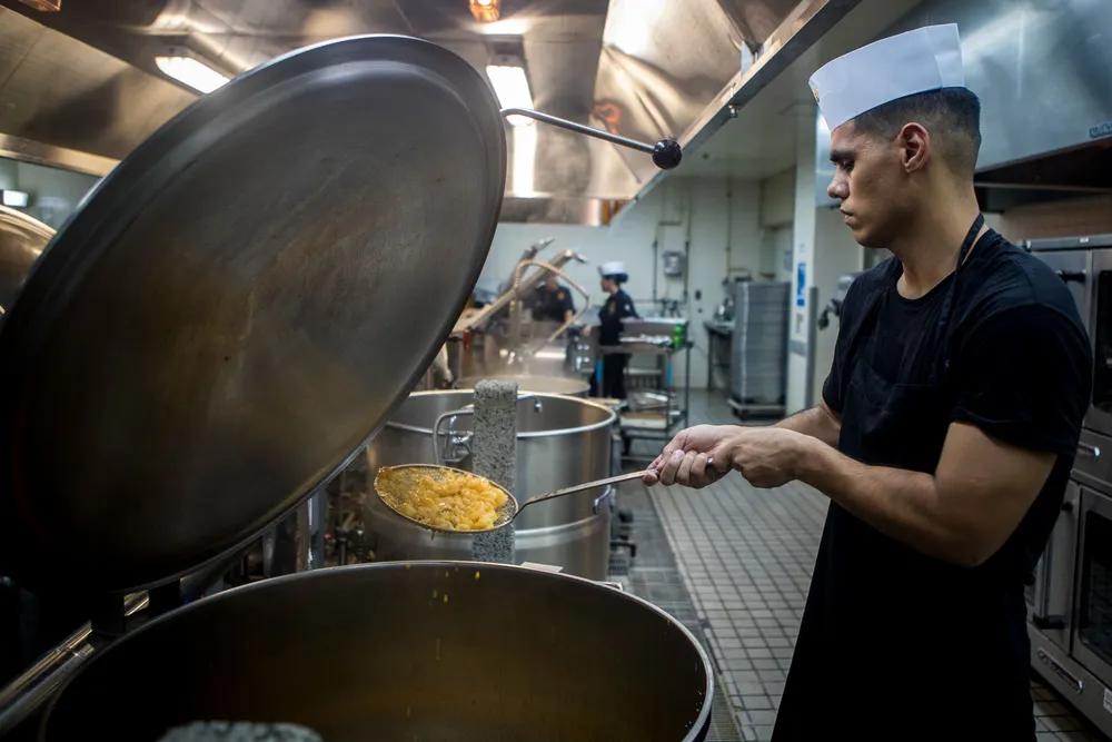1月29日,驻日本美军基地冲绳汉森营厨师正在为海军陆战队准备煮制食材,绝大部分都是预制菜。 美军一餐饭都是白人饭,个人感觉没有食欲。