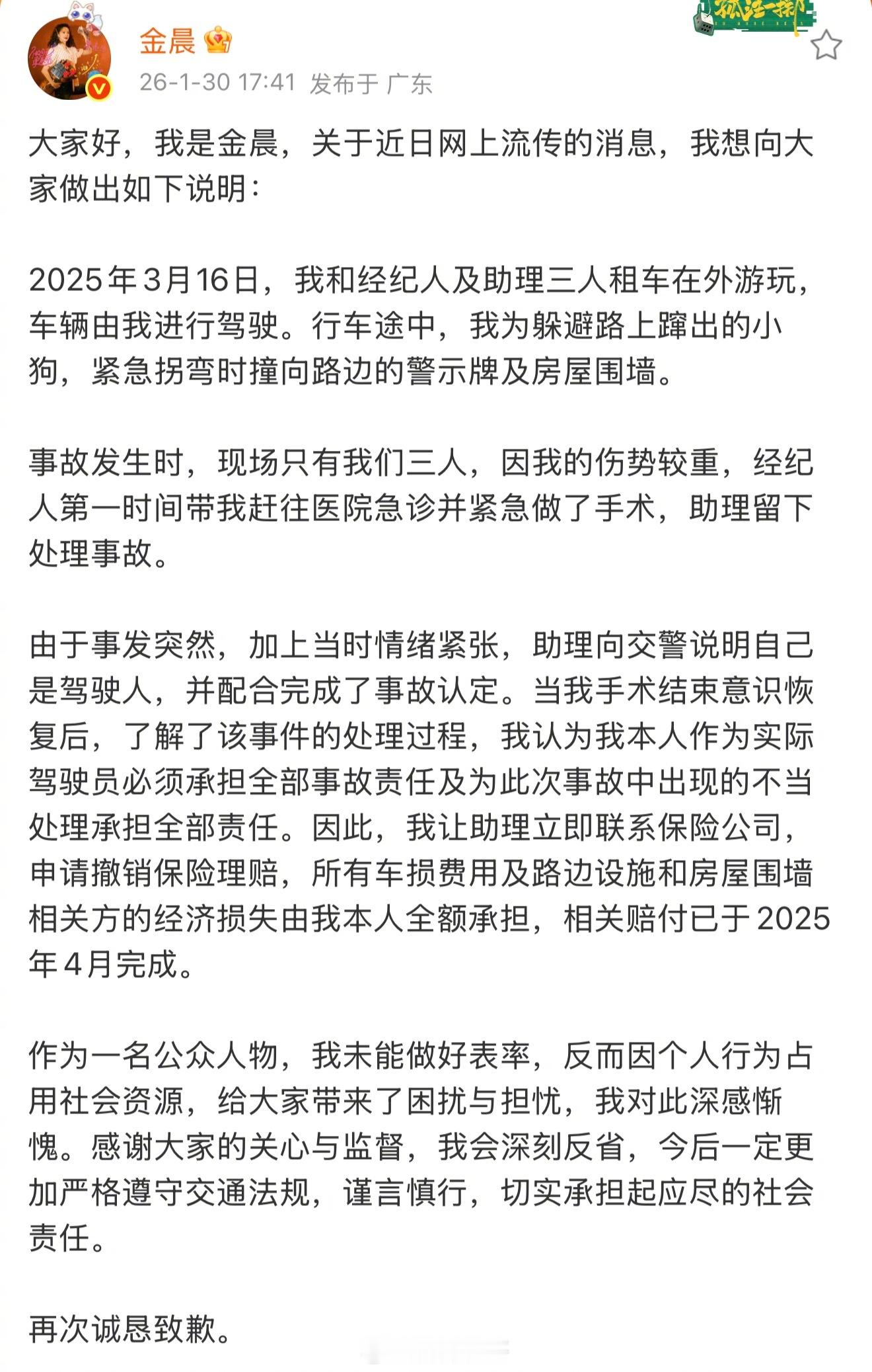至于保险的事,最后没有走保险流程,通报里和金晨说的也一致。