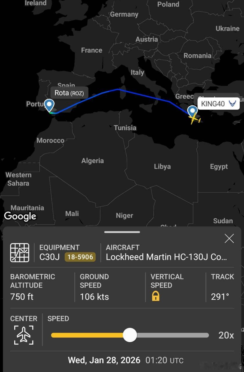 一架美国空军HC-130J“战斗之王 II”(18-5906 )飞机在昨日从罗塔抵达后,已从哈尼亚转移至约旦的穆瓦法克·萨尔蒂空军基地。